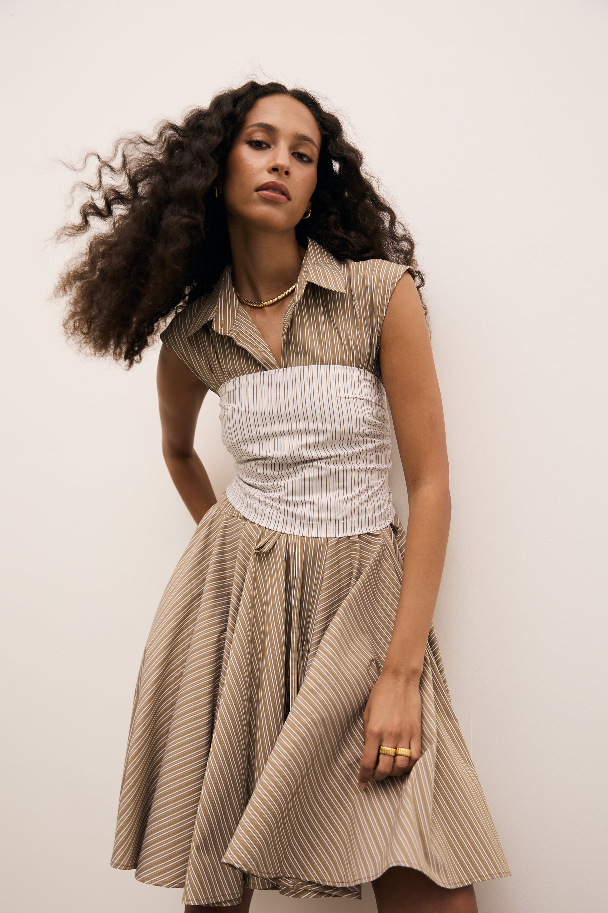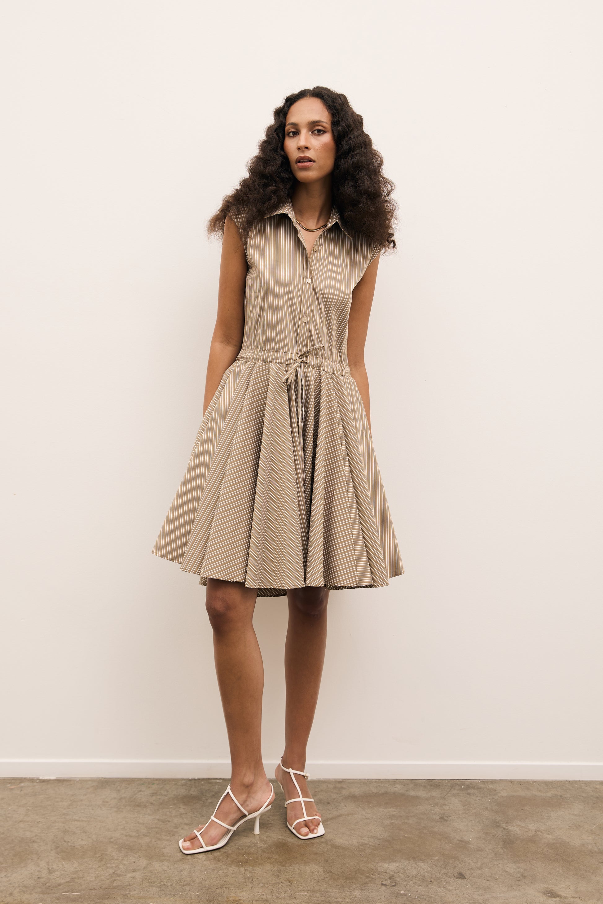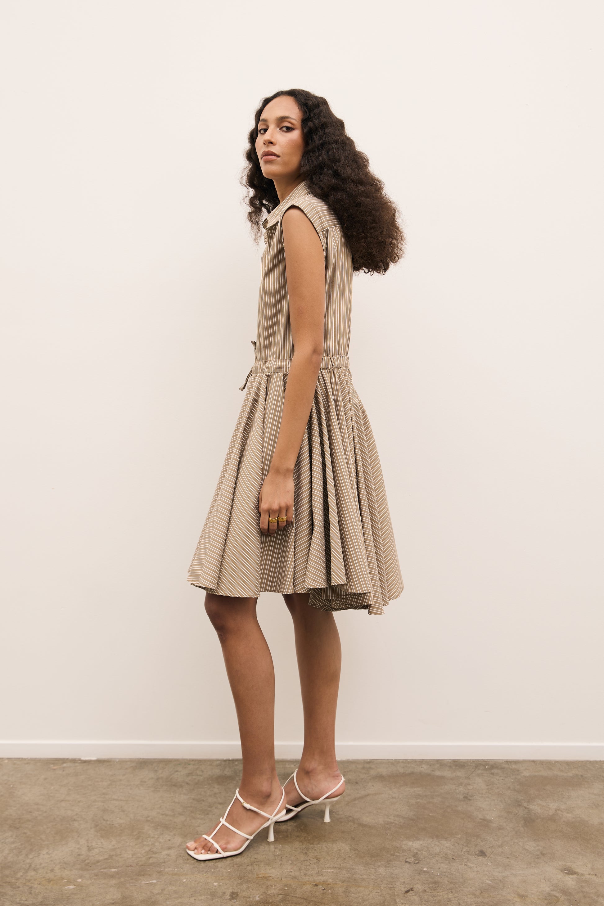 Fitted through the bust for additional fit, it is gathered at the waist and then falls into a soft A-line silhouette that crops below the knees.