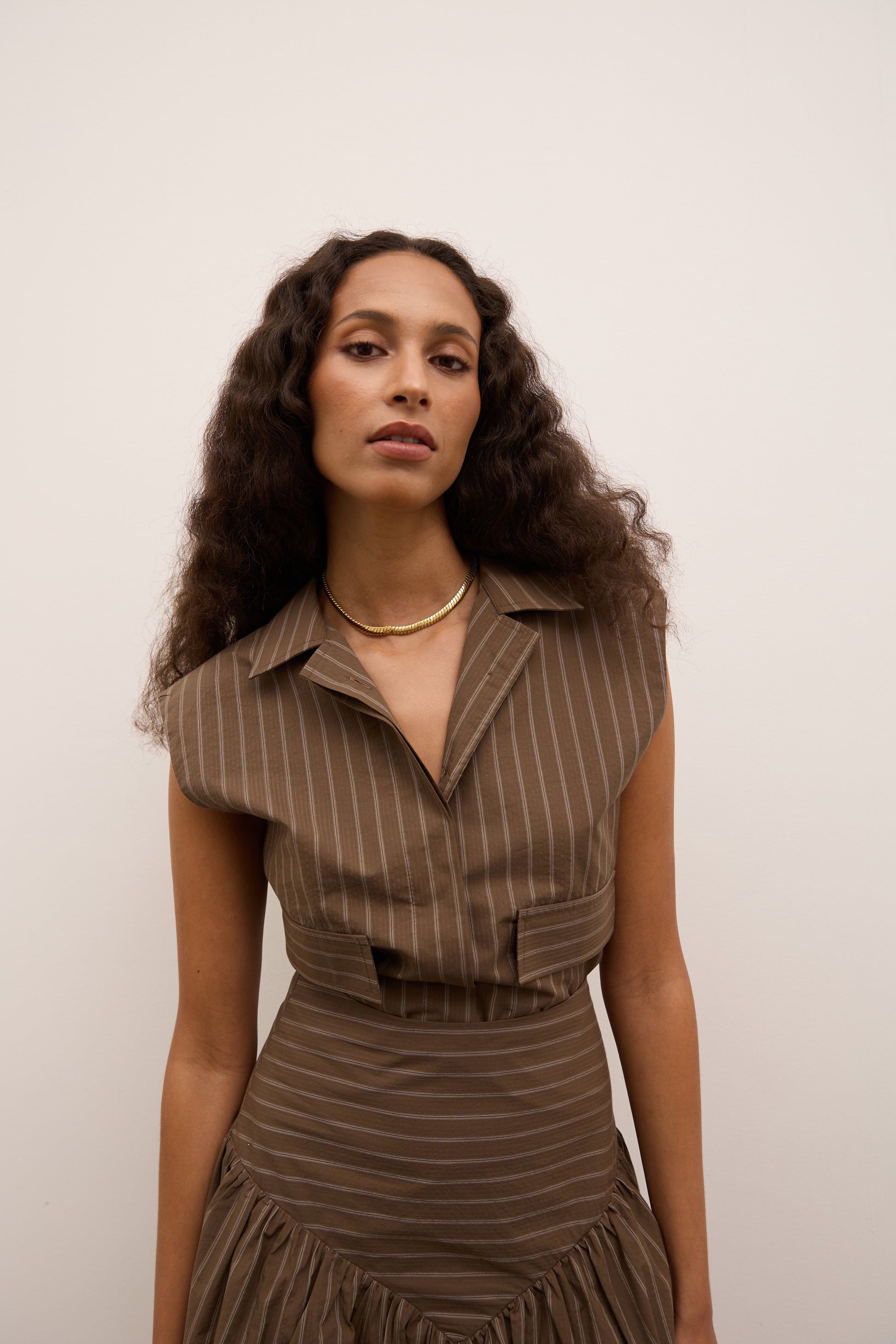 A vest-style cropped blazer with a tailored collar, designed from an ultra soft blend of cotton fabrication in brown. Low shoulder for a summer-approach to suiting, it features a side ropes for a cinched waist at the back, and a front button for easy closure. Front pockets. Designed to be loose on the body, it crops below the waist.