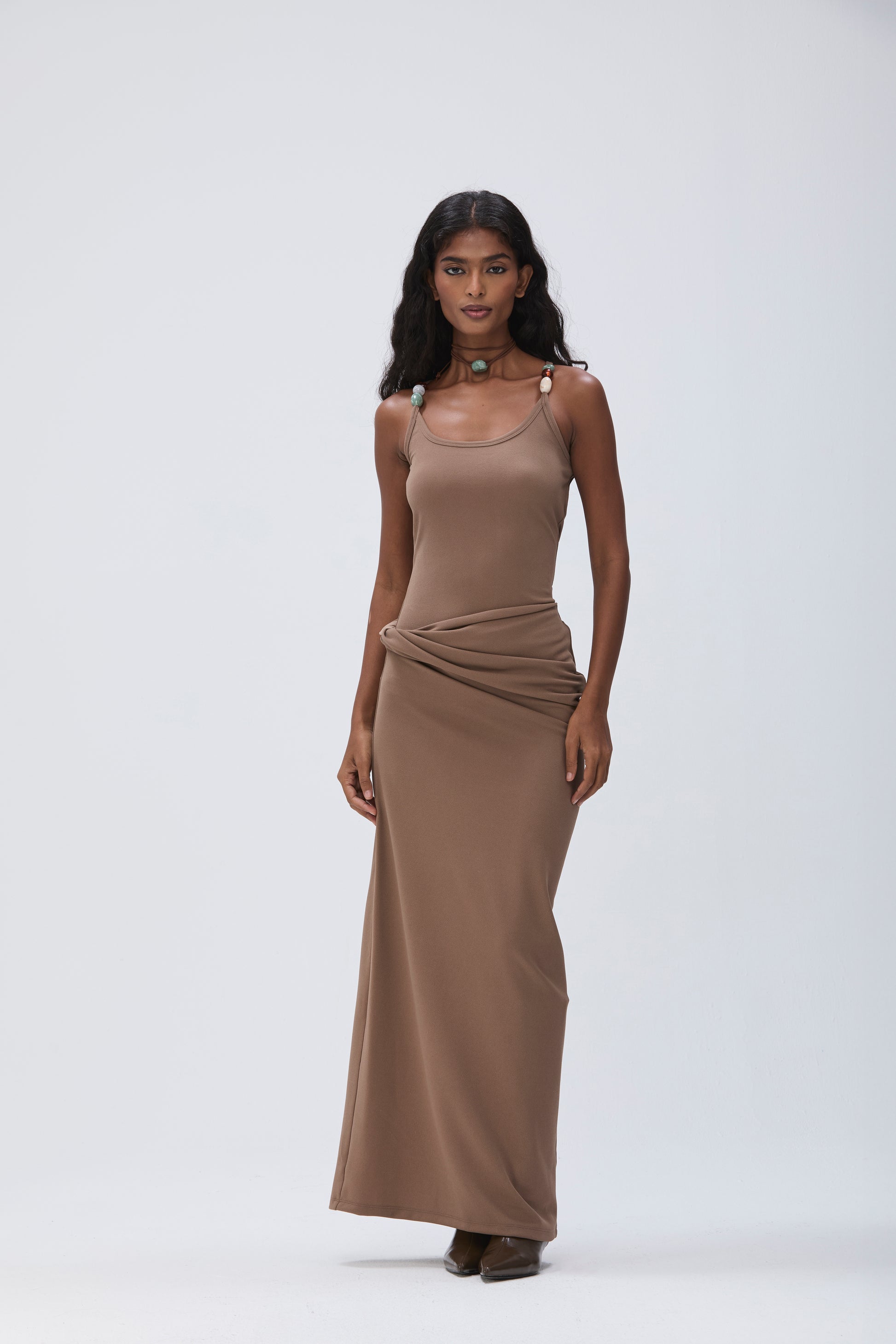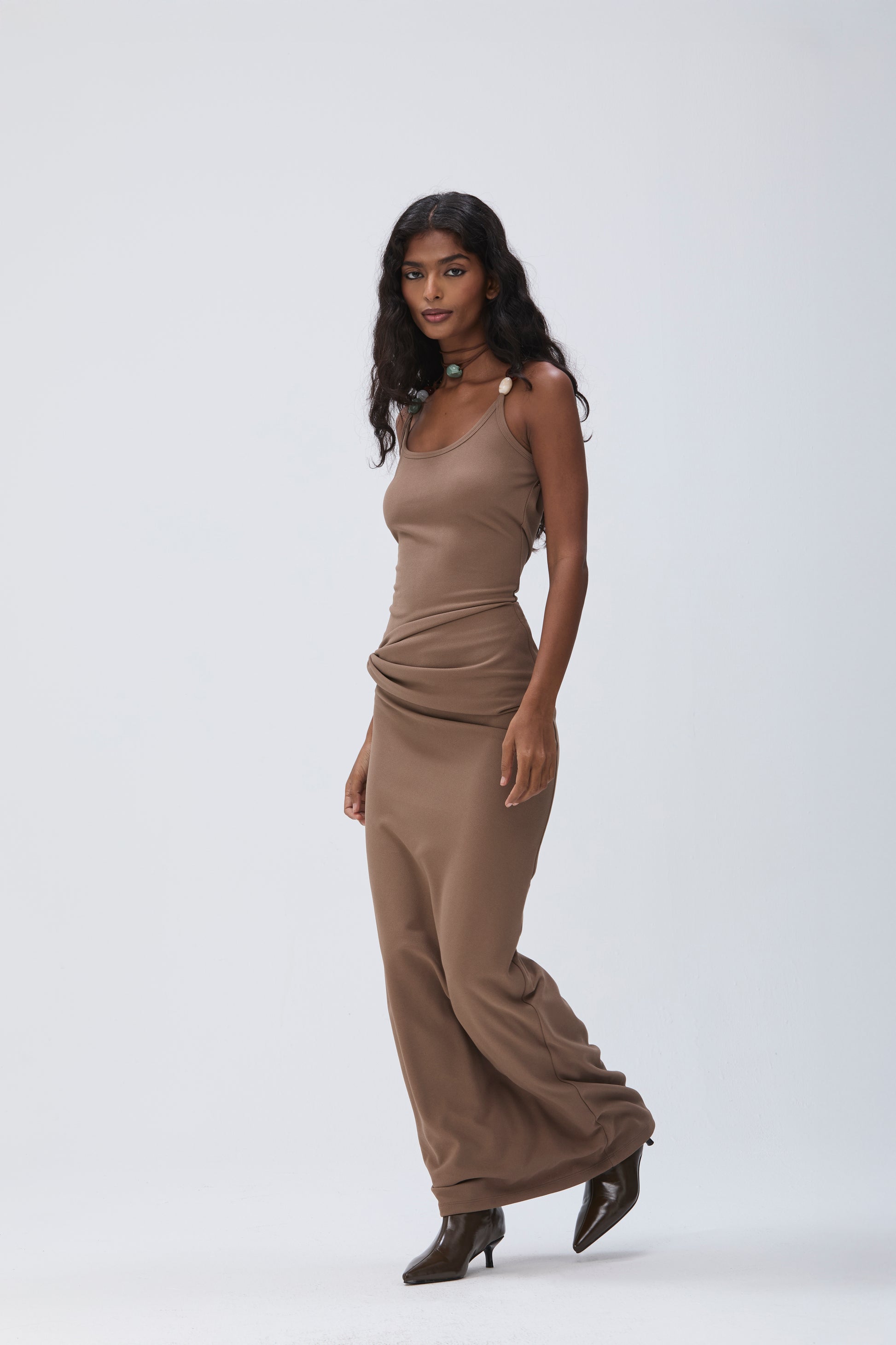Paired with a fitted skirt crafted from woven cotton stretch fabric, designed to hug the hips and fall just below the ankles. Features a draped foldover waist for added dimension.