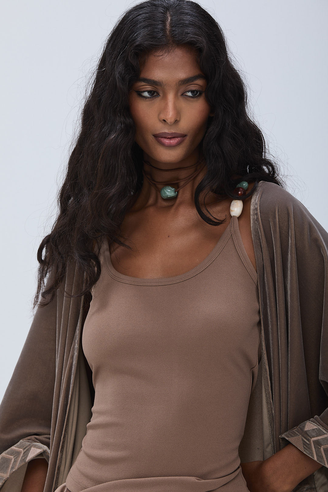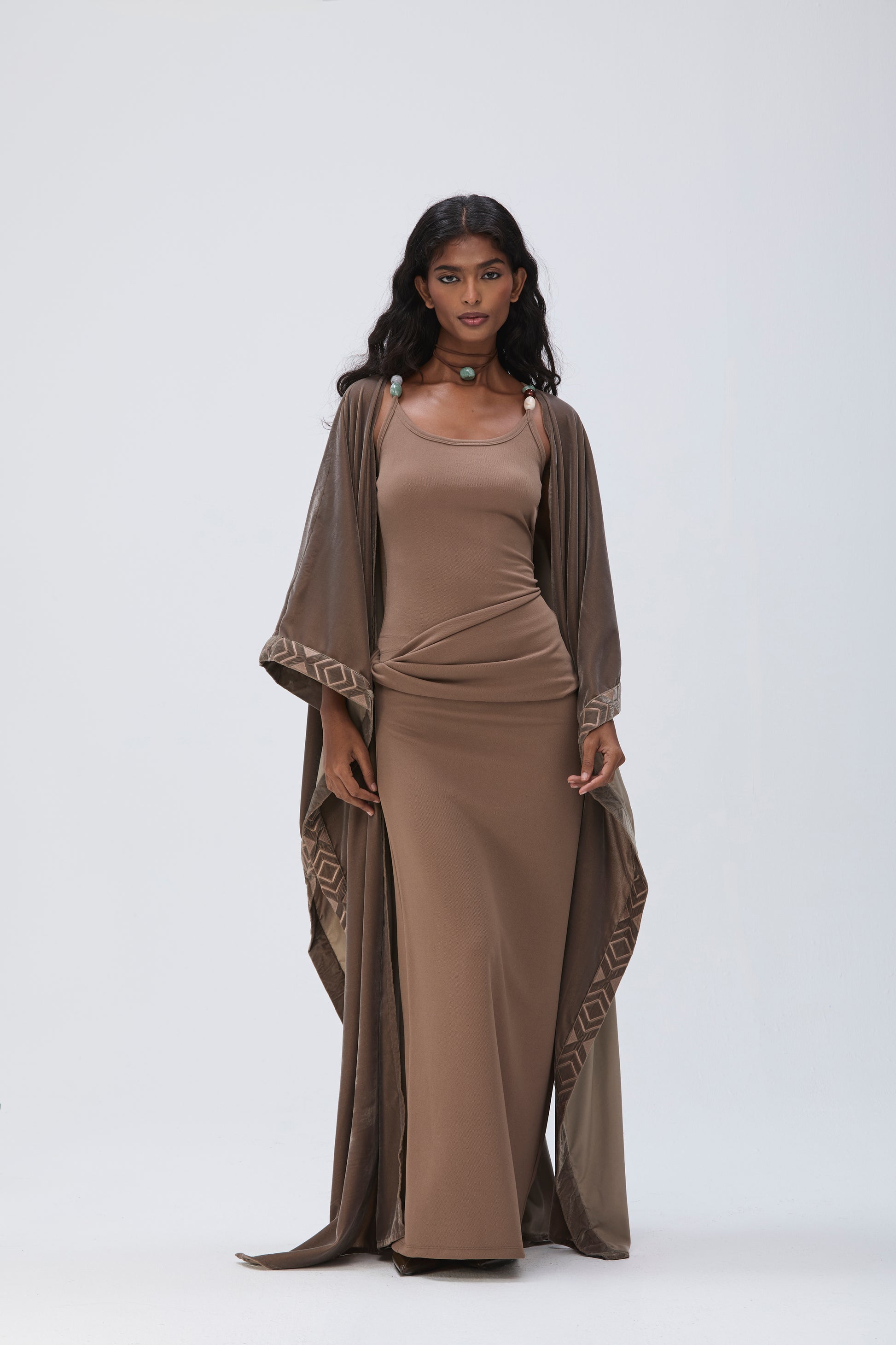 PERLÉS is a 3 piece coord: Bisht, top and a draped skirt.