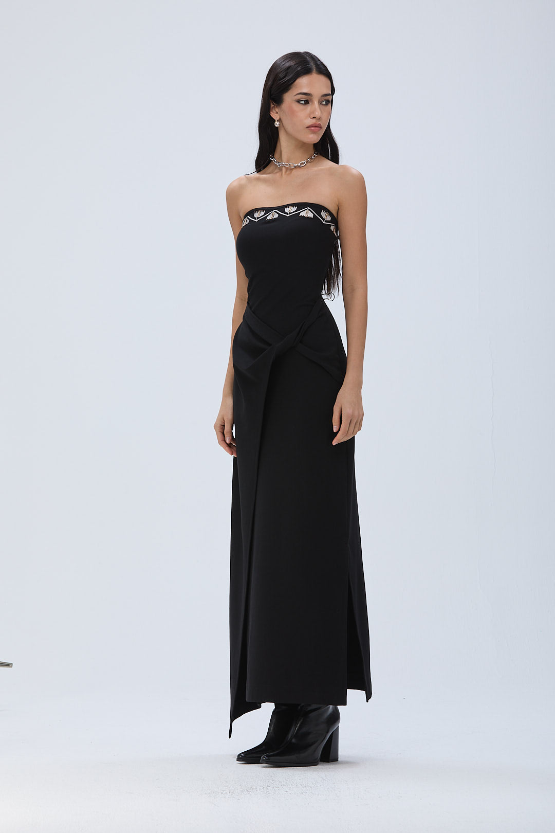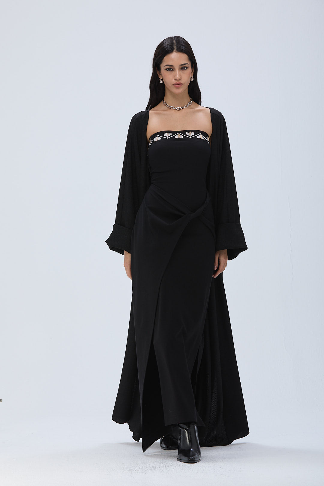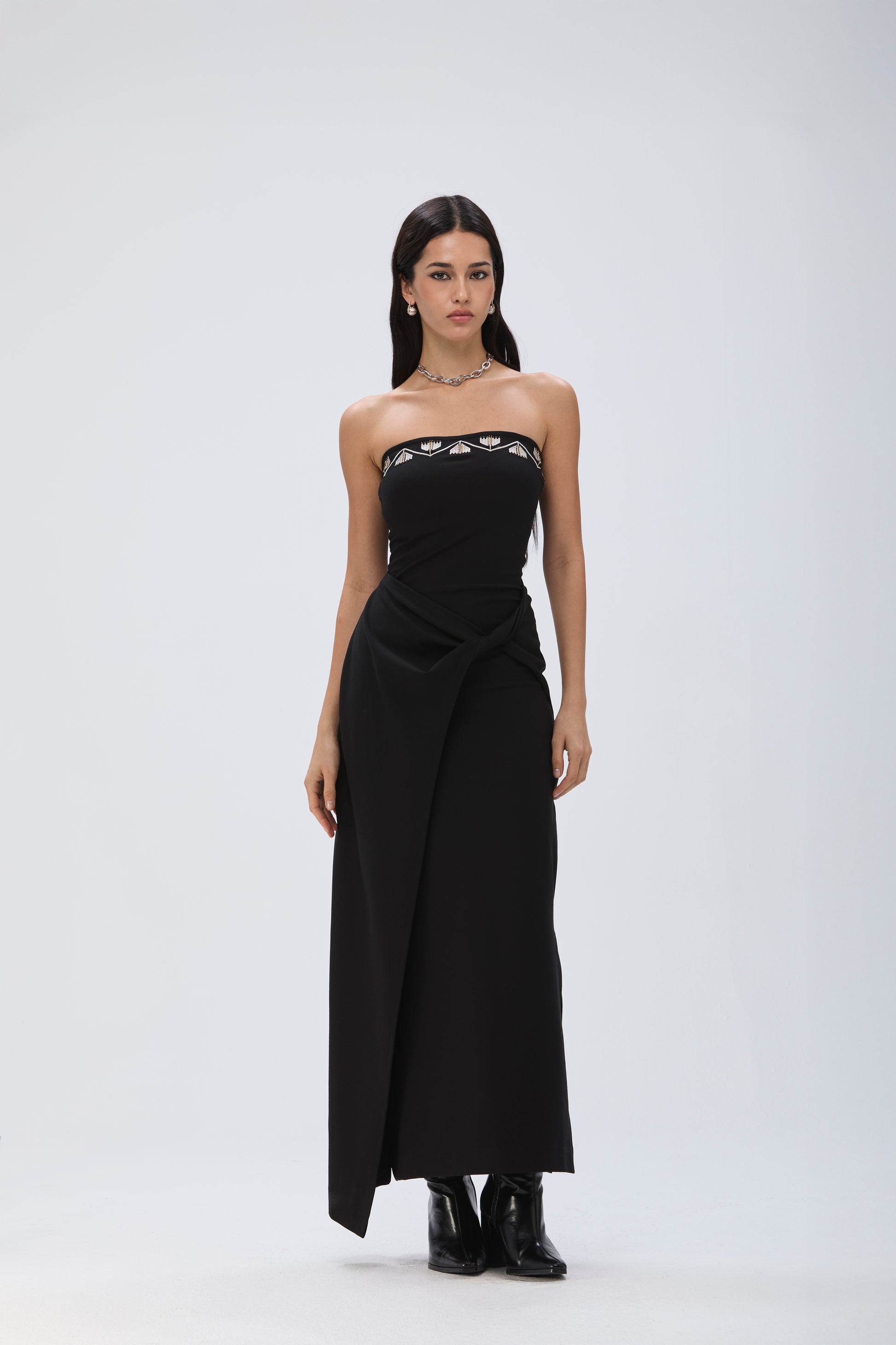 A matching co-ord dress featuring a strapless fitted bodice crafted from thick cotton stretch, elevated with contrast silver embroidery and gold hand embellishment. The design features a fold-over draped layer from the waist down, falling just below the ankles, and is finished with a side slit and a back zipper for easy wear.