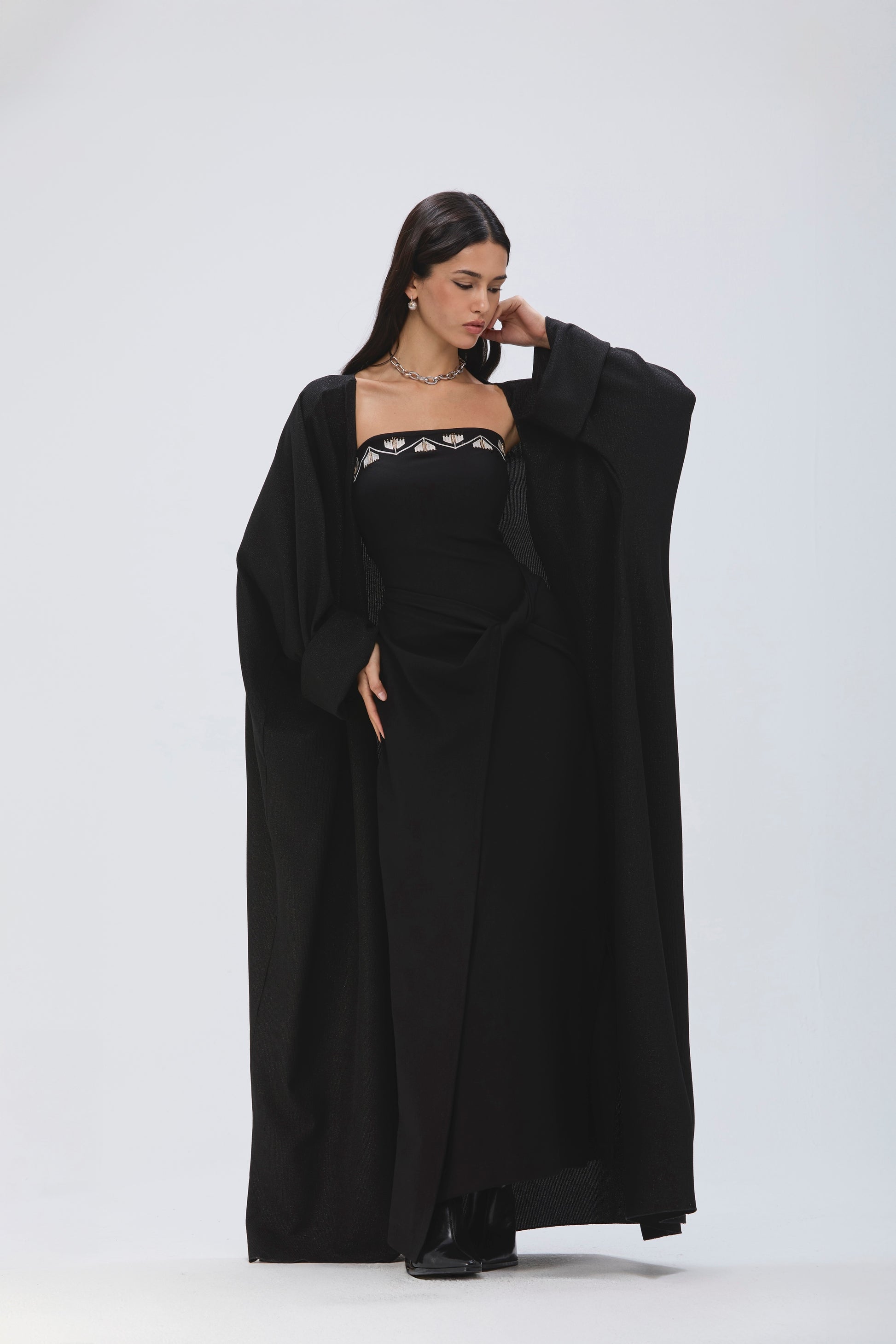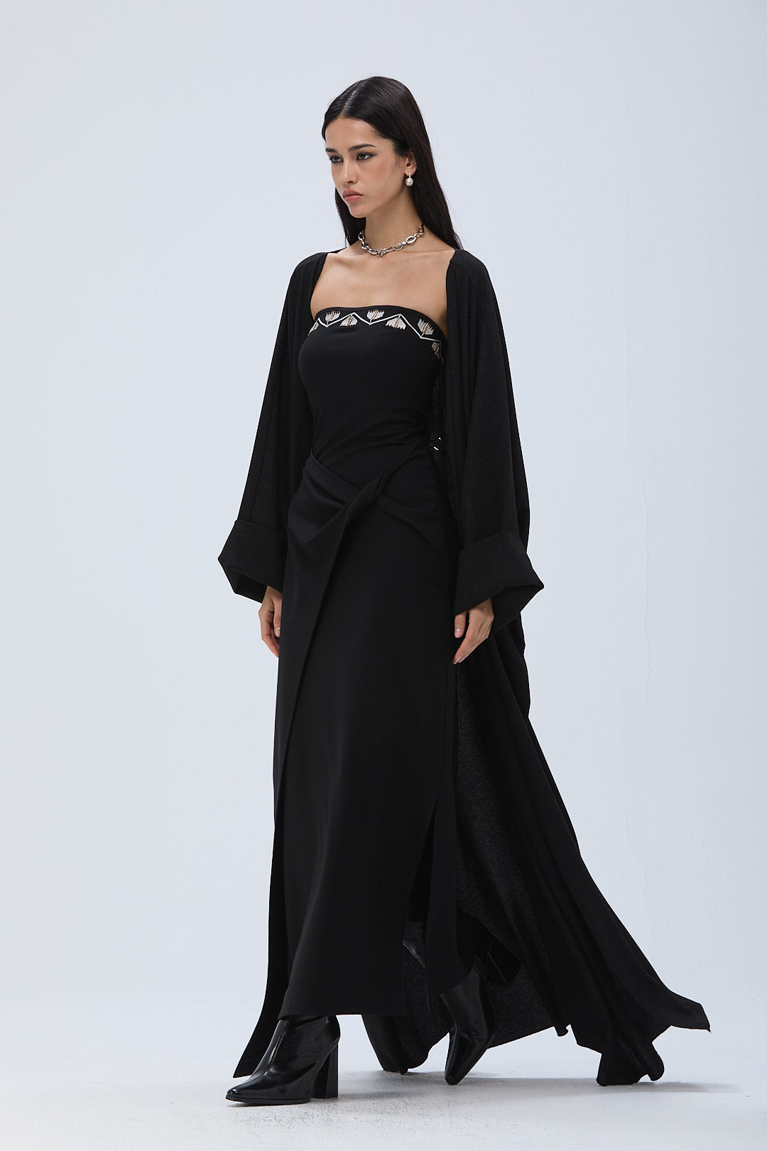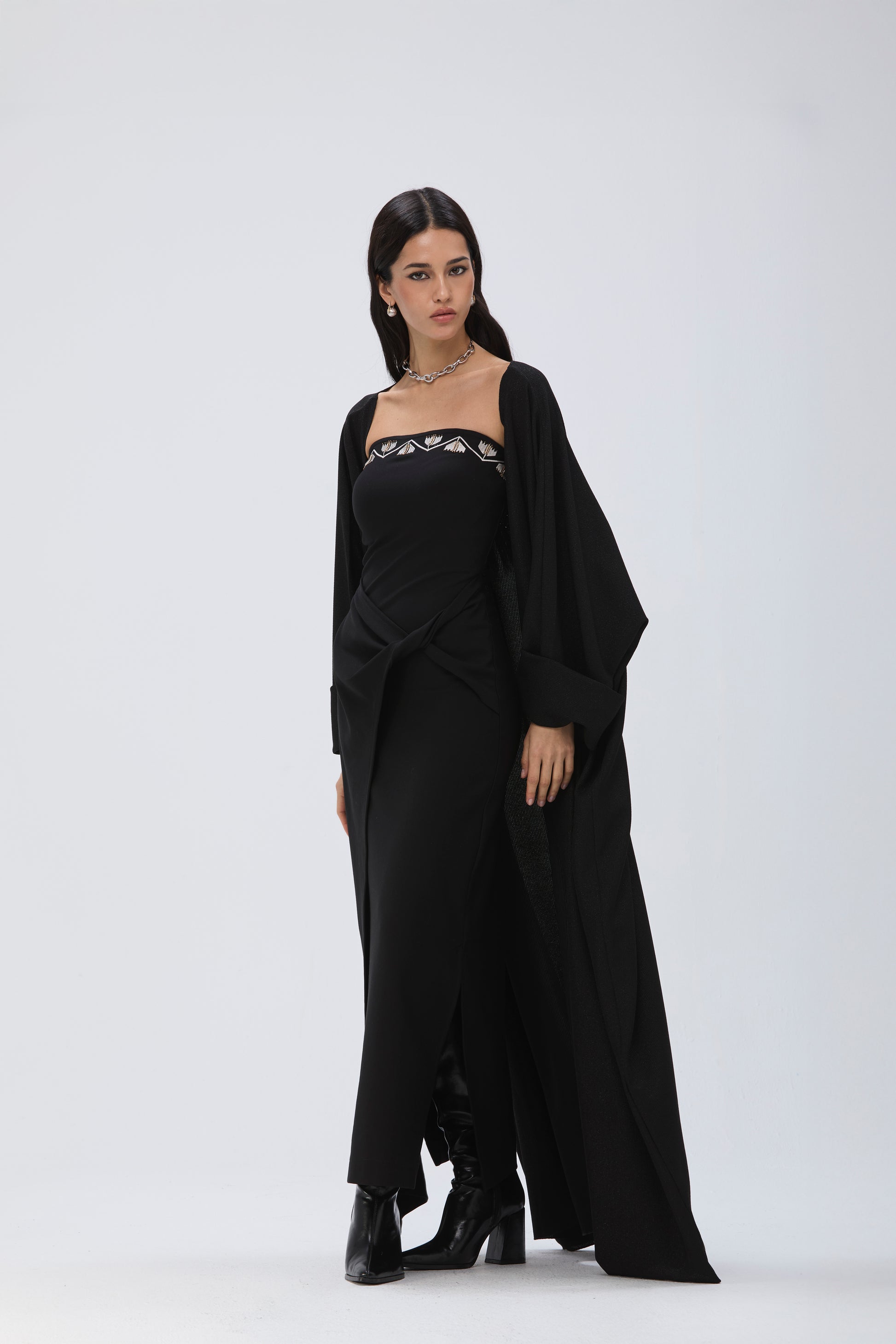 A matching co-ord dress featuring a strapless fitted bodice crafted from thick cotton stretch, elevated with contrast silver embroidery and gold hand embellishment. The design features a fold-over draped layer from the waist down, falling just below the ankles, and is finished with a side slit and a back zipper for easy wear.
