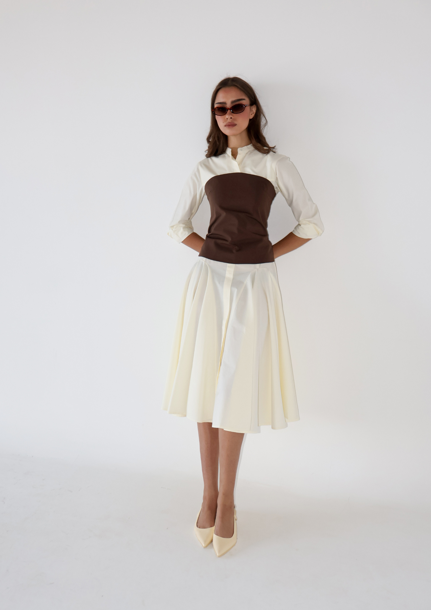 Fitted through the bust for additional fit, it is gathered at the waist and then falls into a soft A-line silhouette that crops ankle length. With front & back pleated cuts for a volume flow effect.