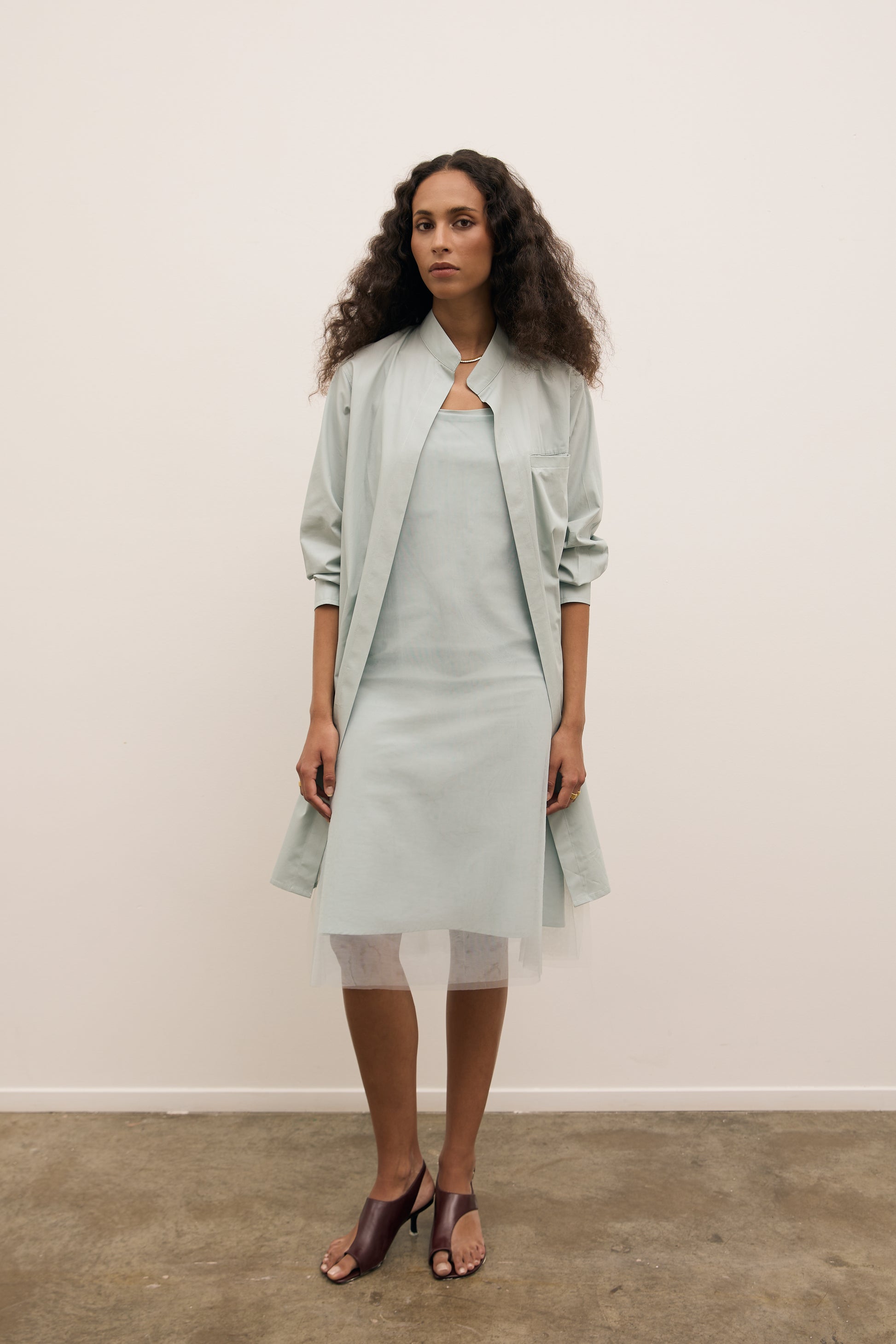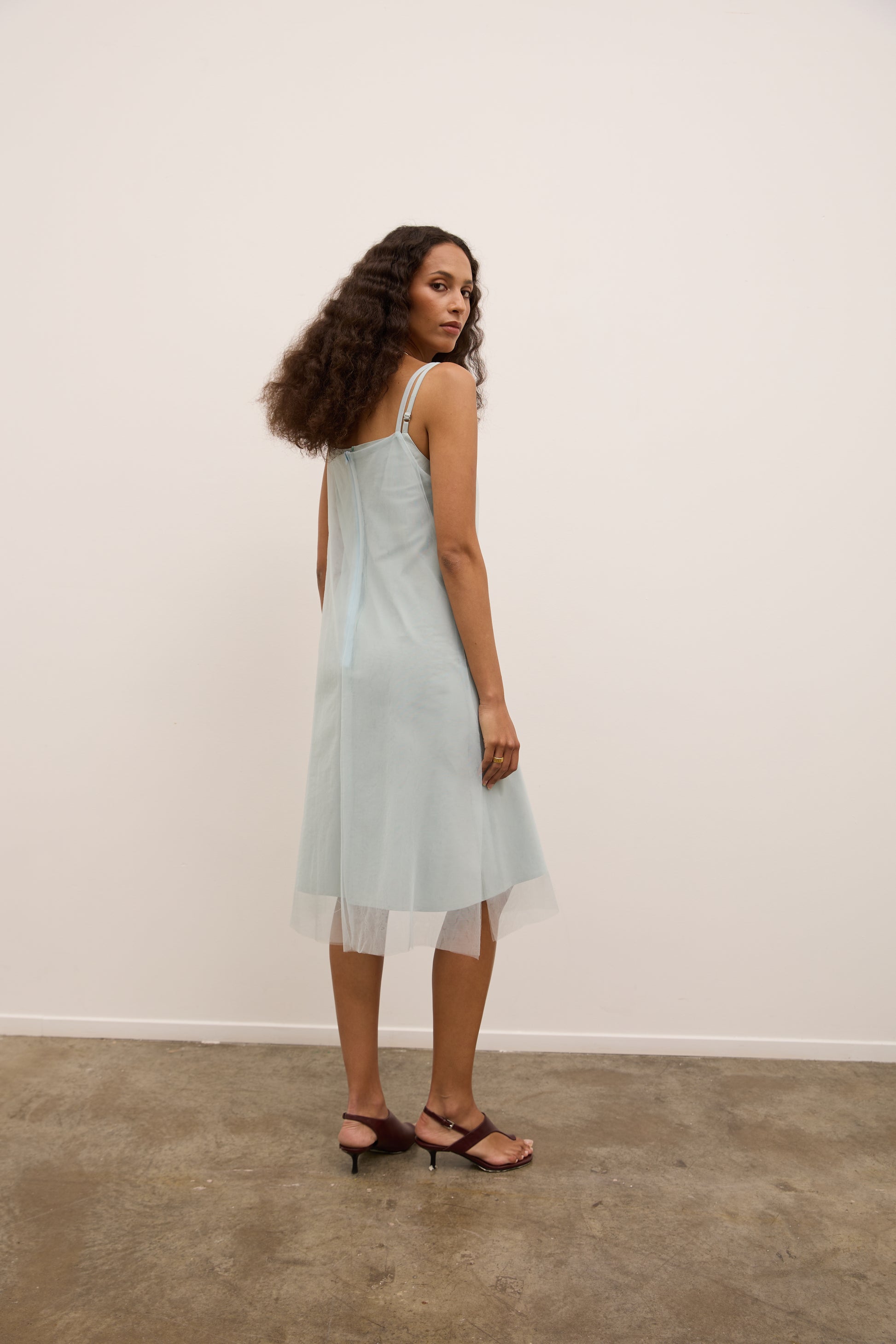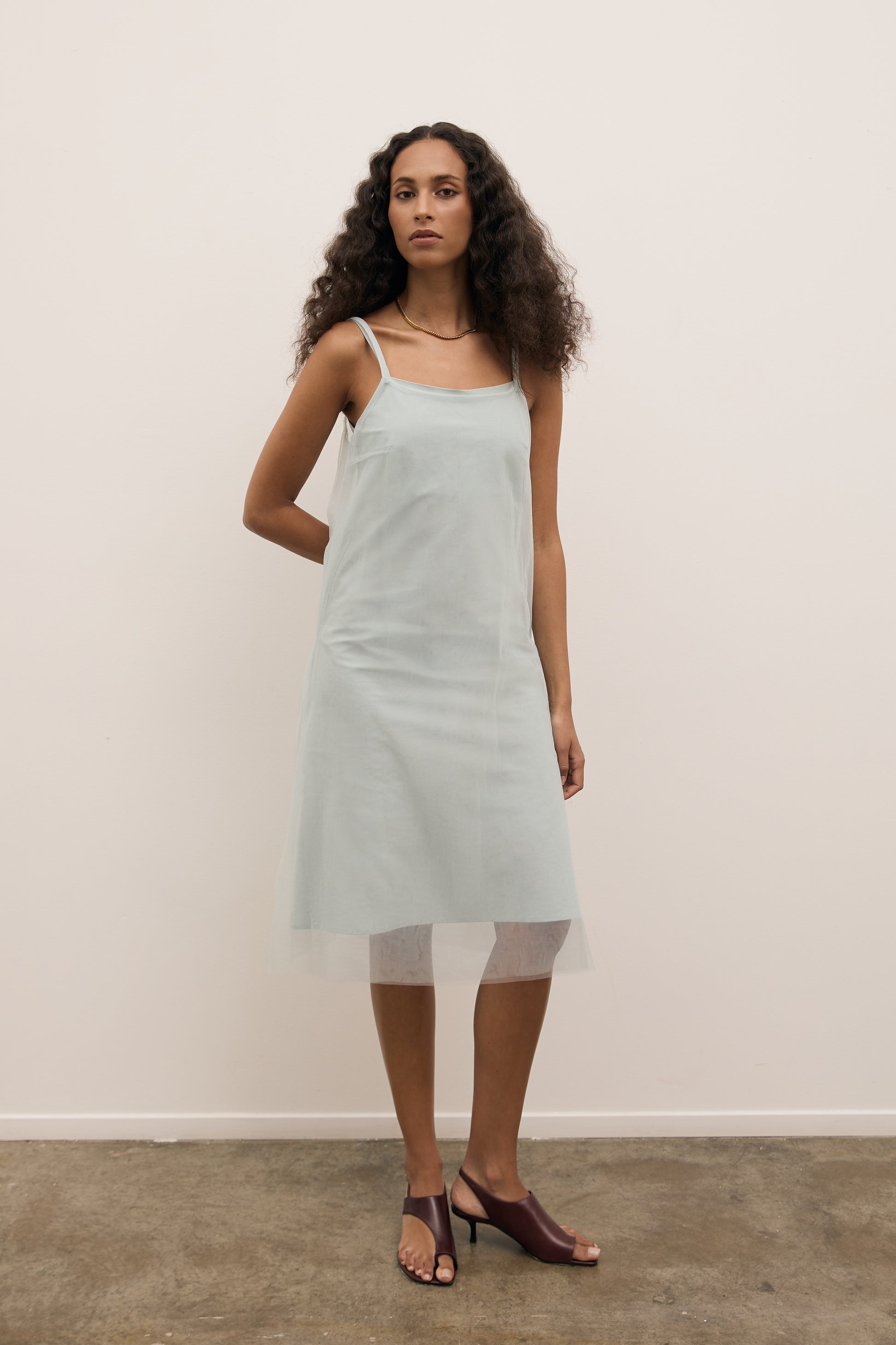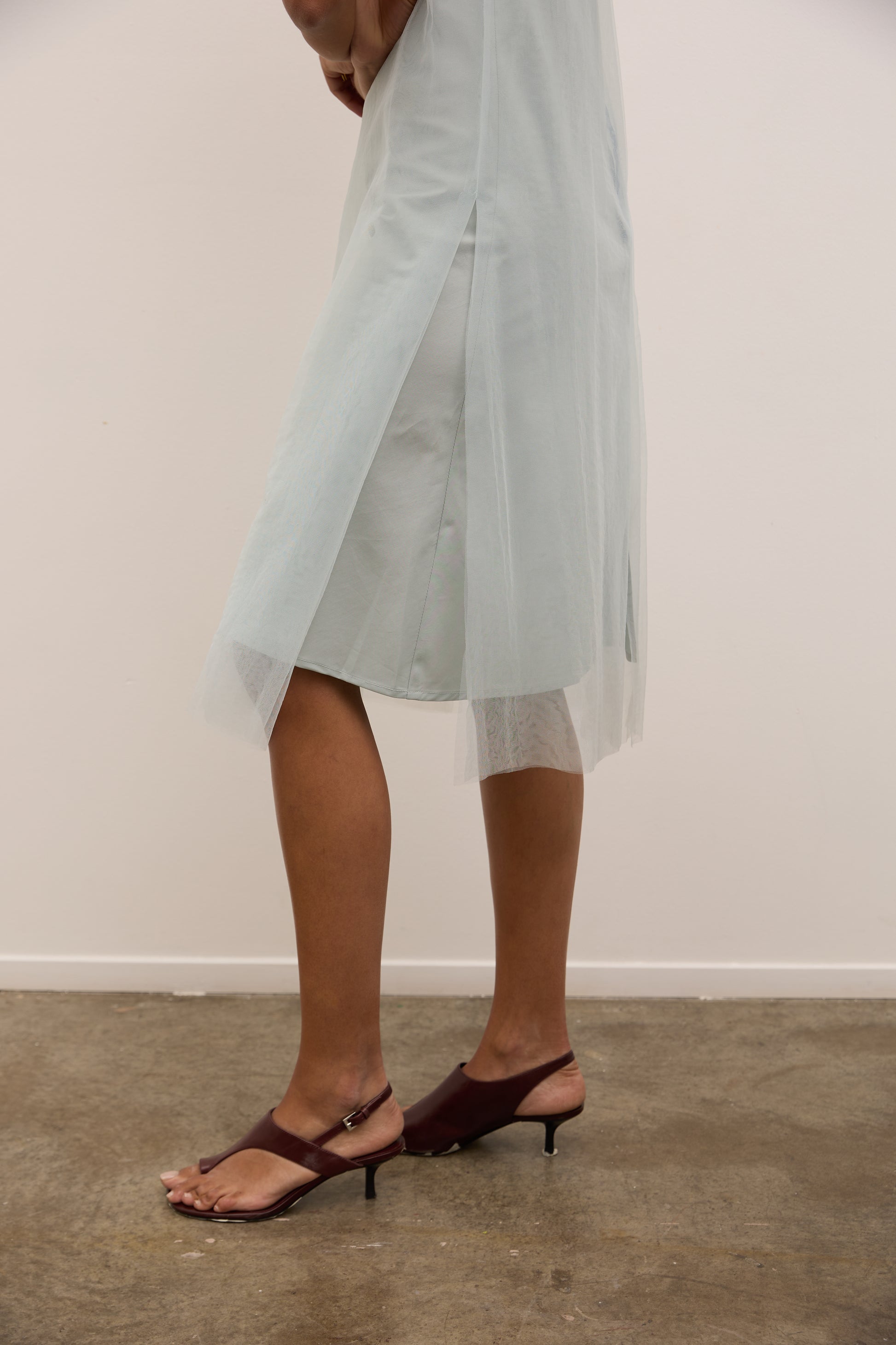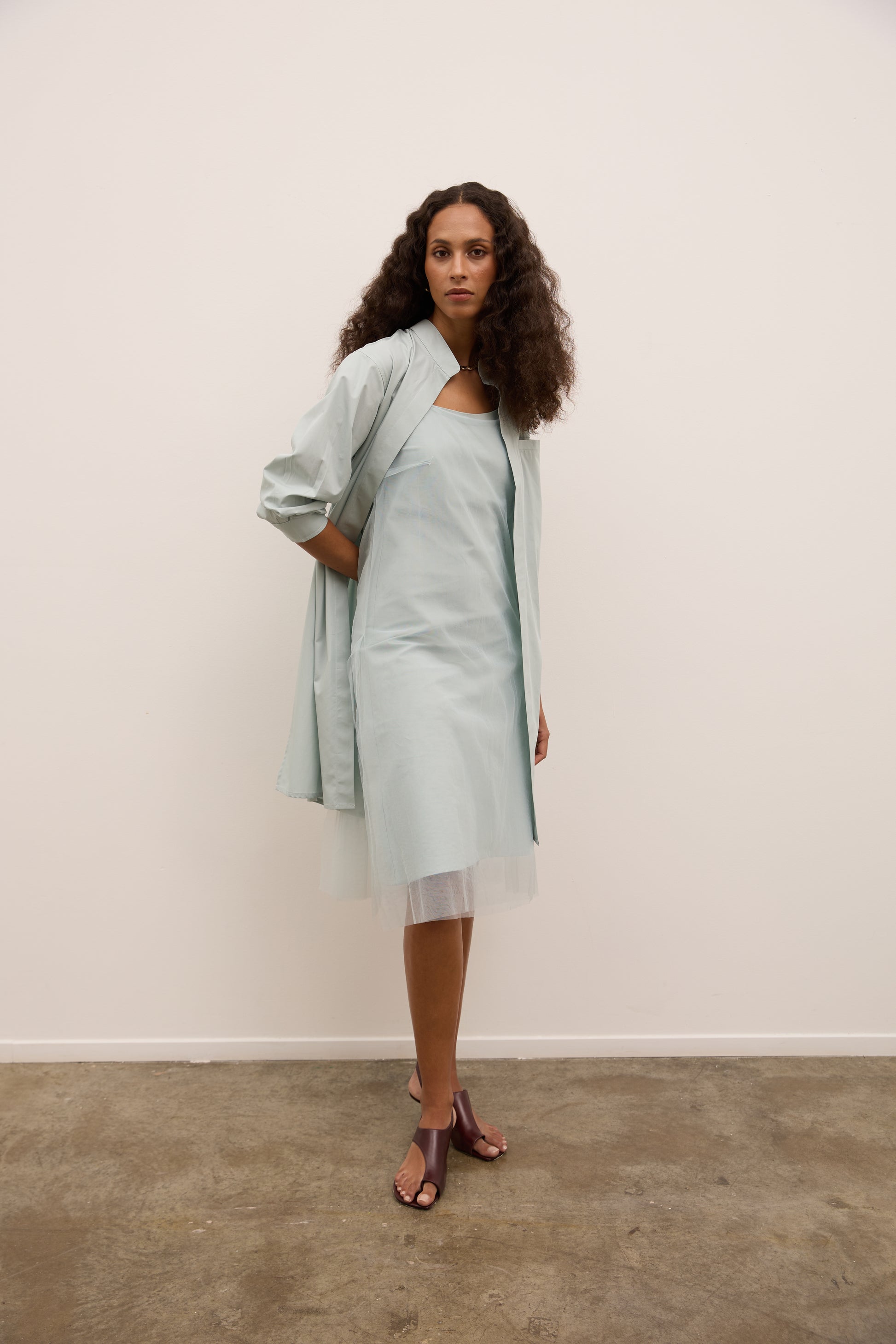 A matching coord inner dress that features a back zipper closure and a sheer tulle overlay layer either worn with or without to the slip for a more a flattering look. Designed to be a relaxed fit on the body, it crops below the knees.