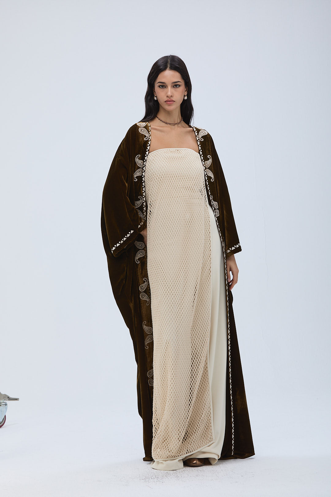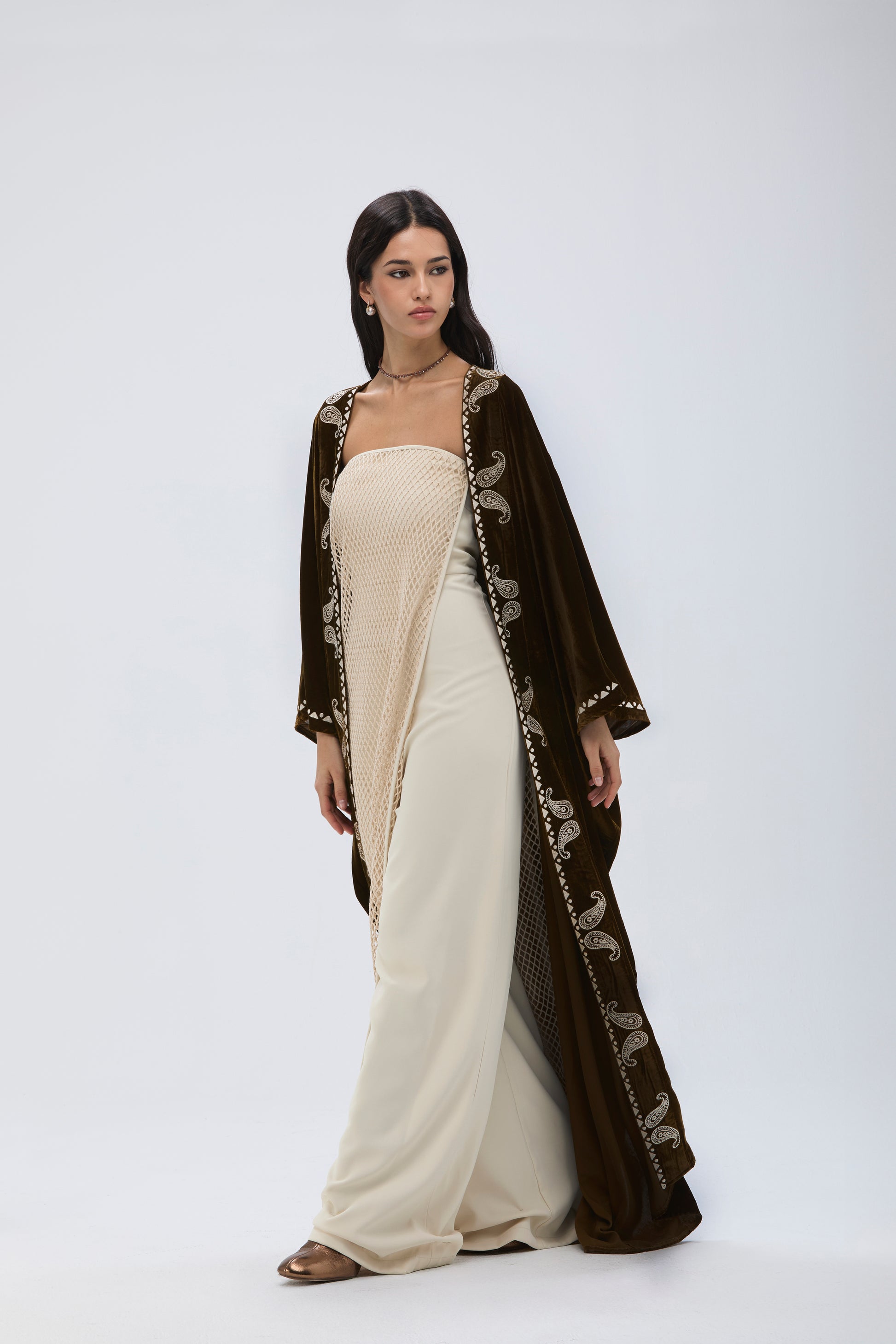 A velvet coordinated bisht with a relaxed oversized silhouette, detailed with contrast cream paisley embroidery.