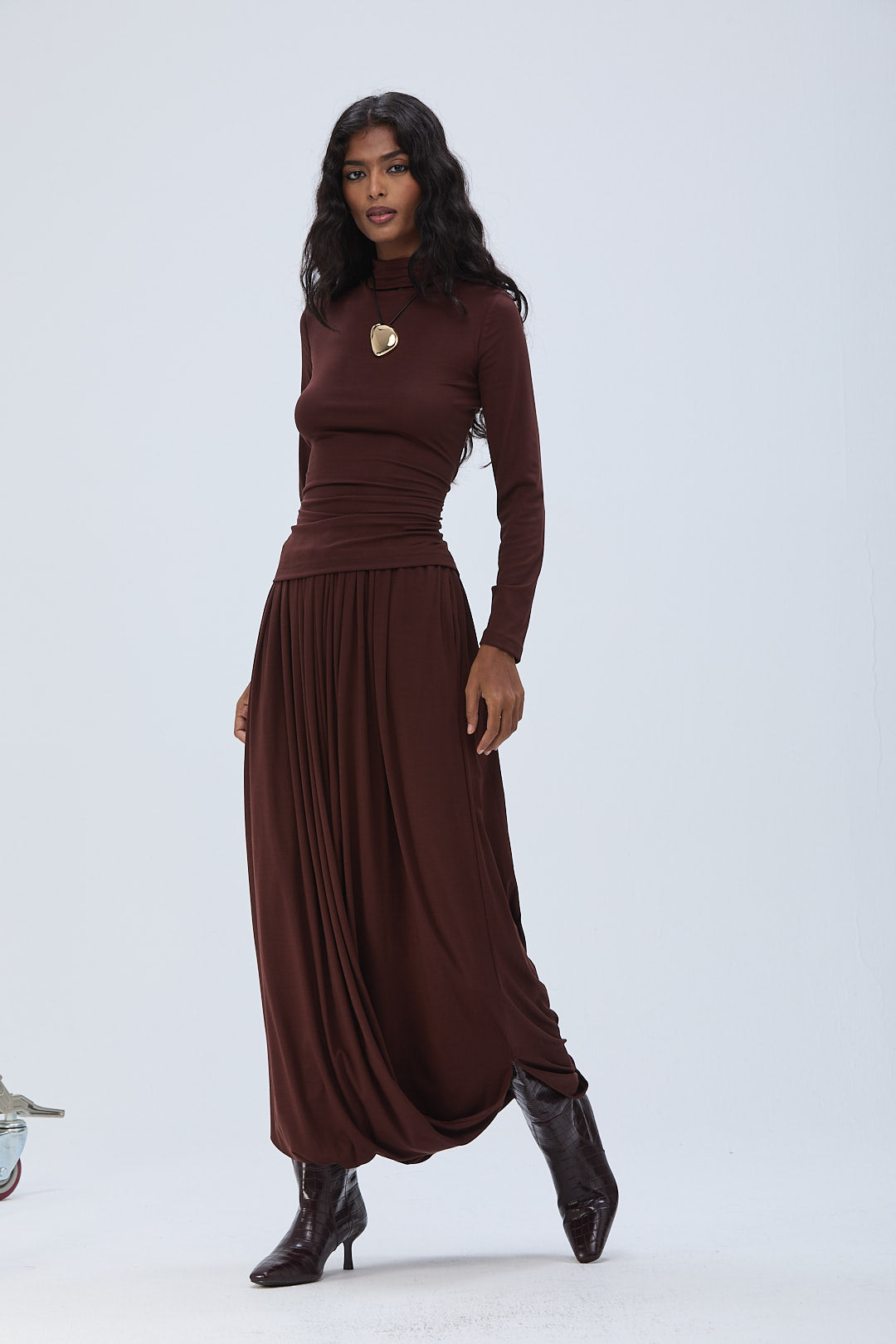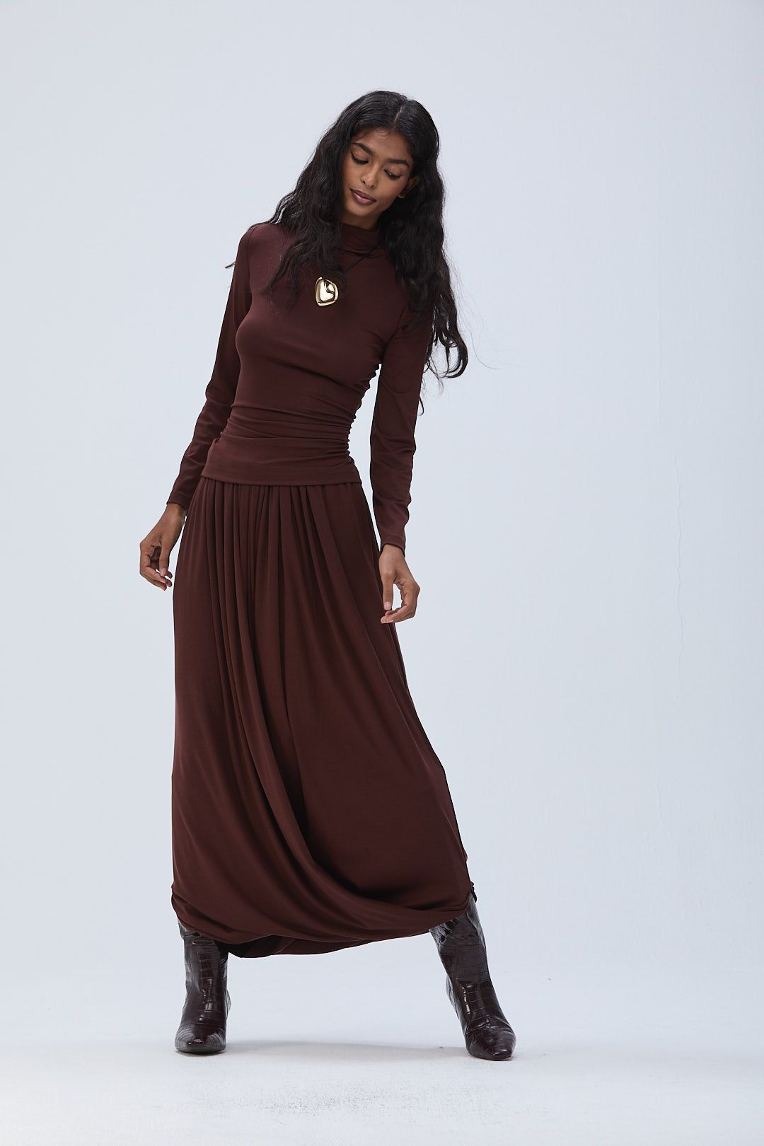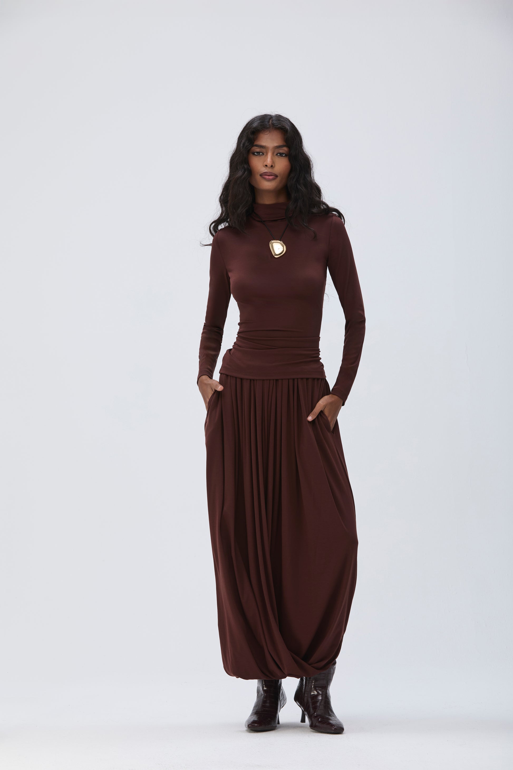 Paired with a skirt crafted from recycled acetate cotton stretch fabric, featuring an elastic waist and a draped fold-over silhouette that sits just below the hips. Featuring an elastic waist and side pockets. This piece can be styled as either a skirt or a harem pant, with a length that falls just below the ankles.