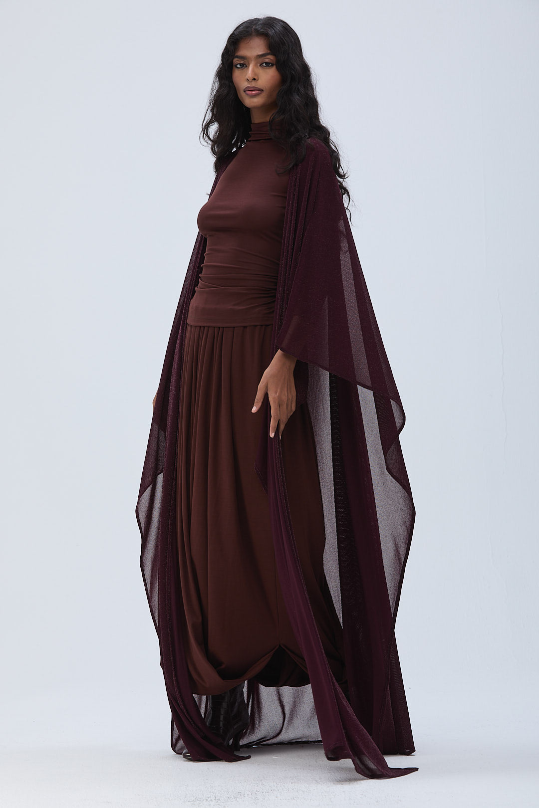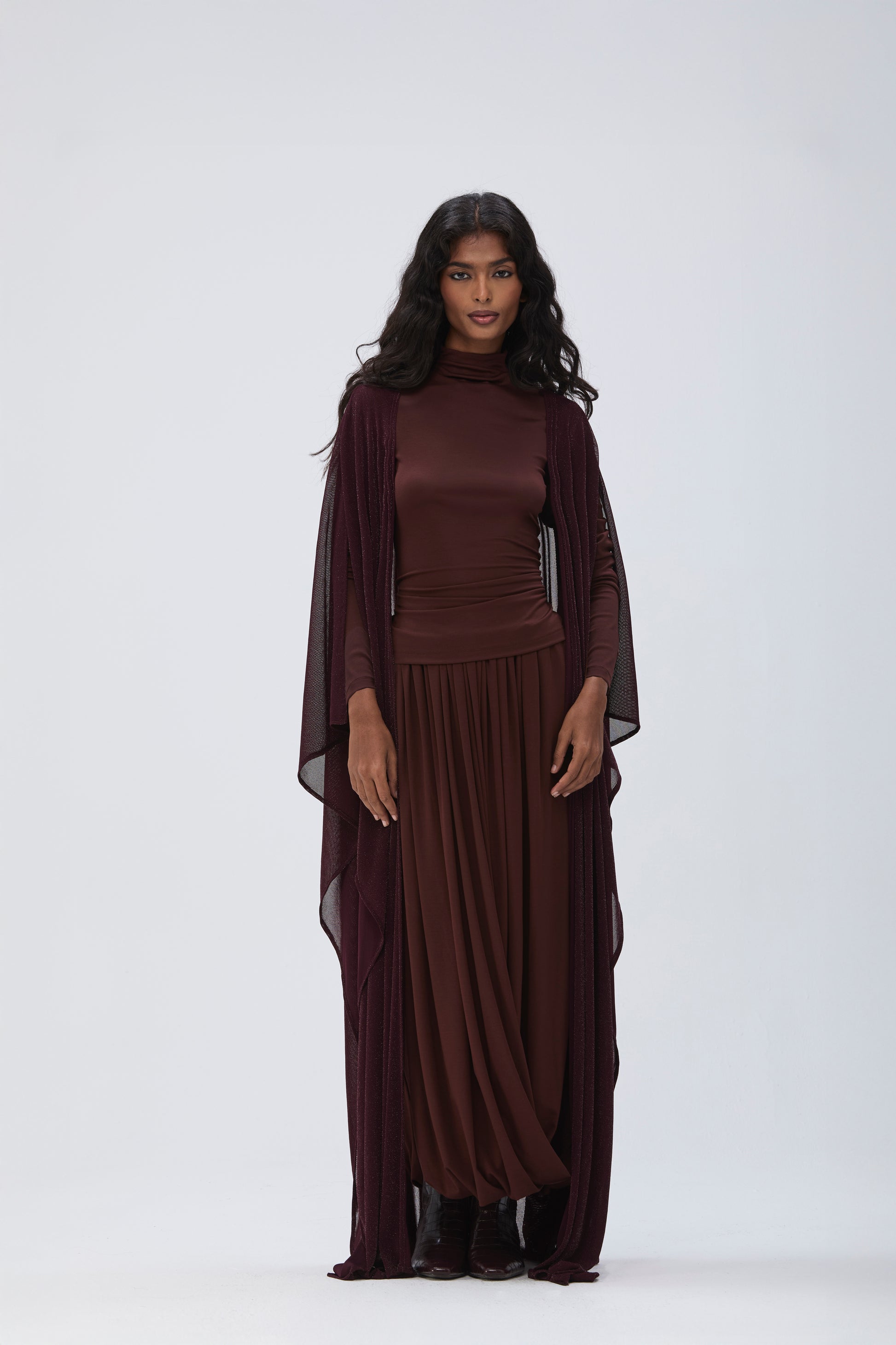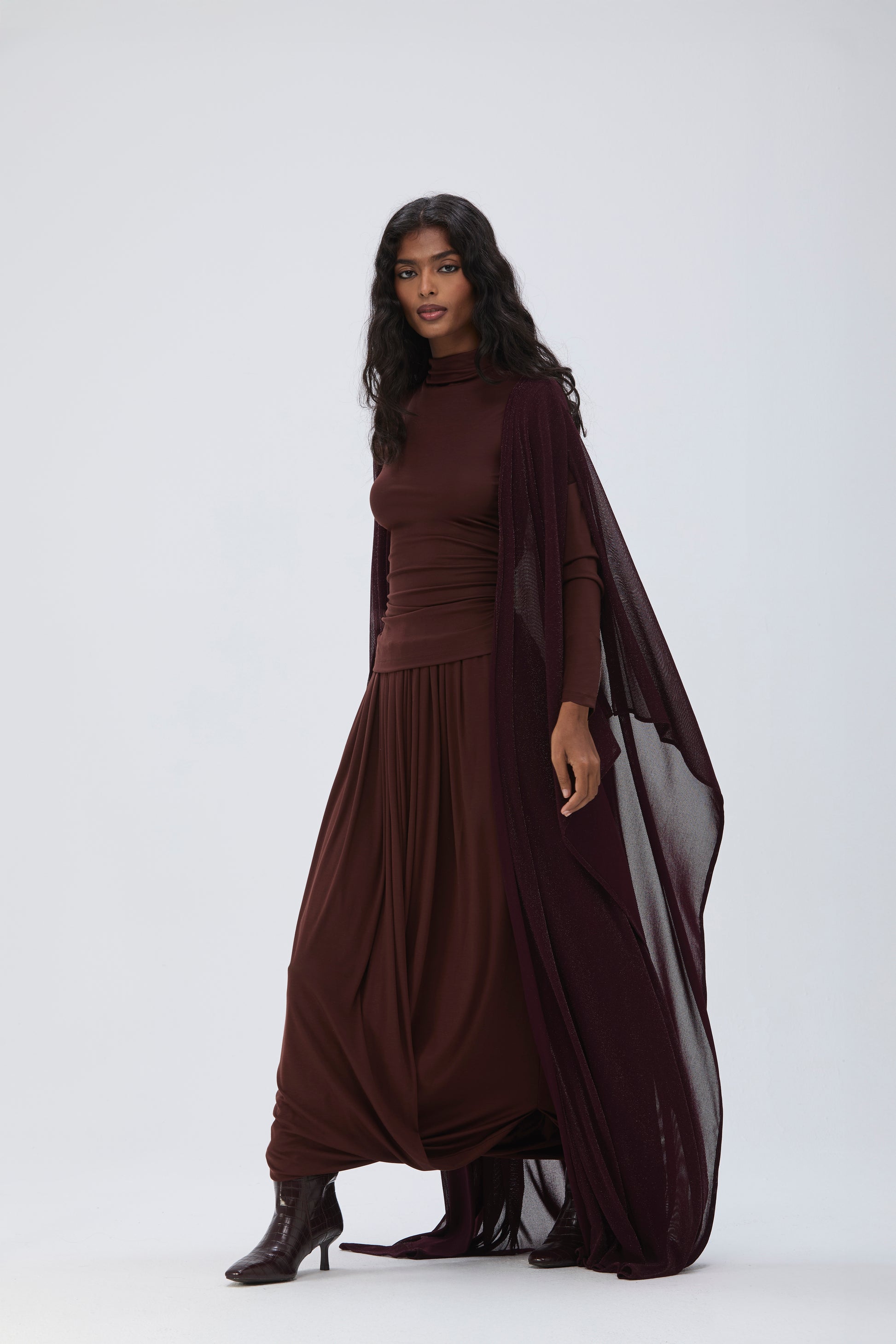 PHATIMÁ is a 3 piece coord: Bisht, top and a draped skirt.