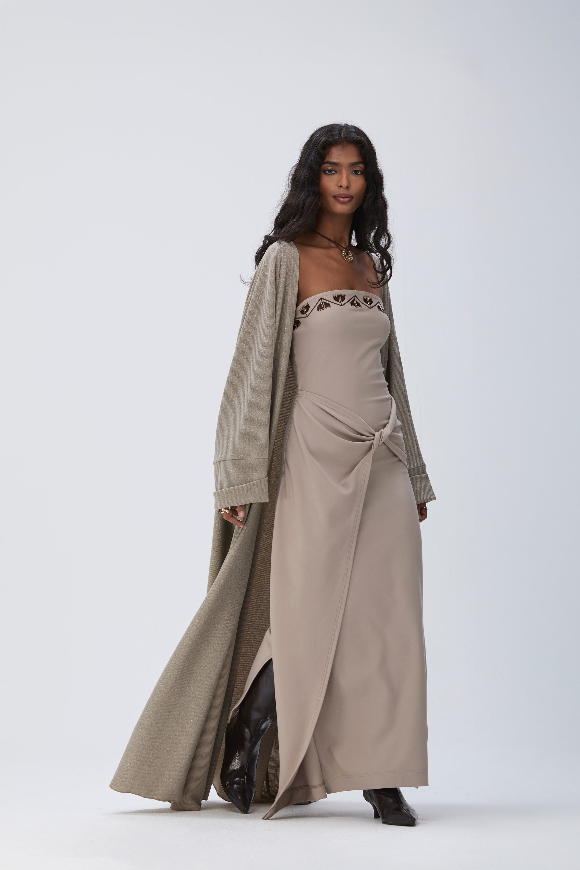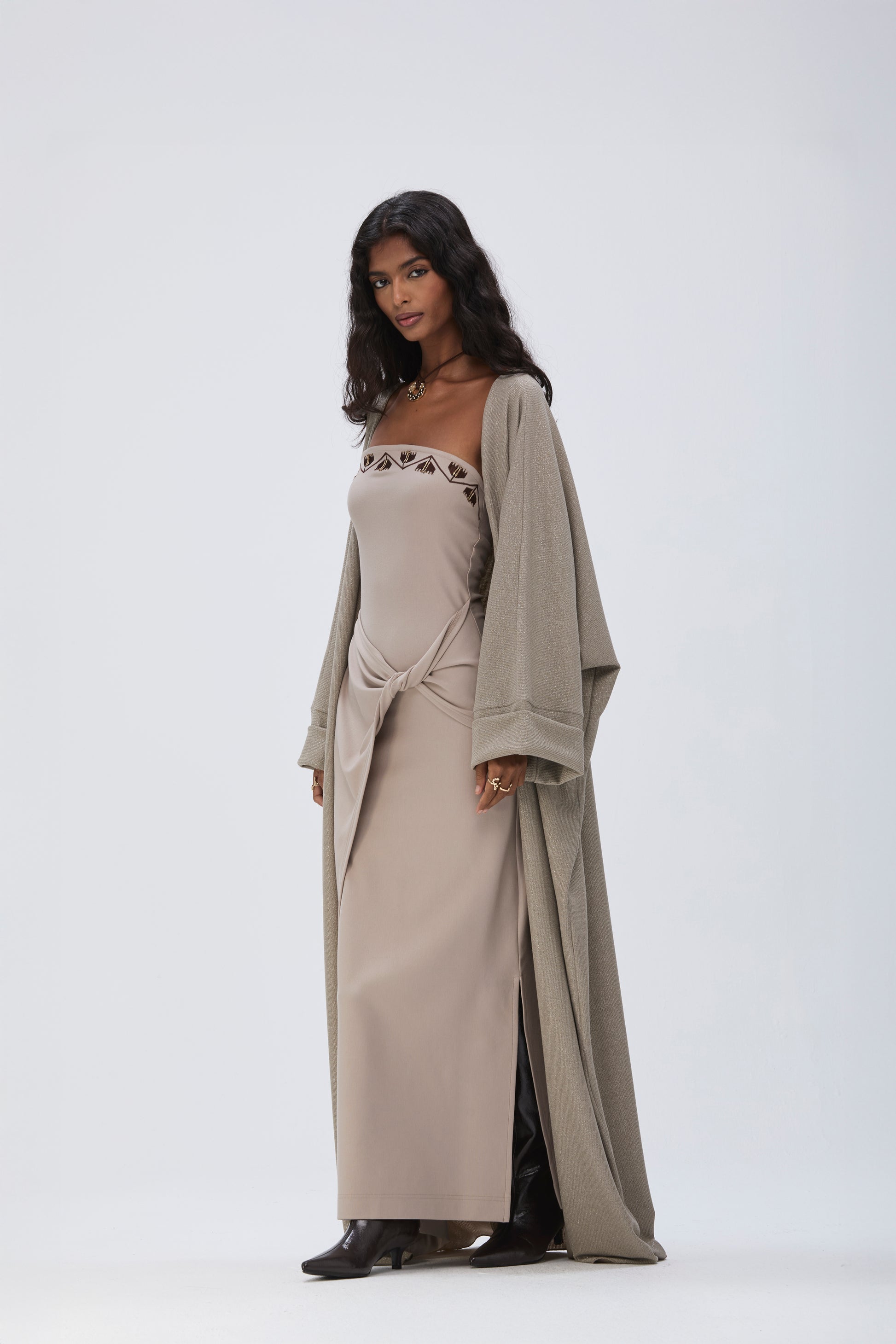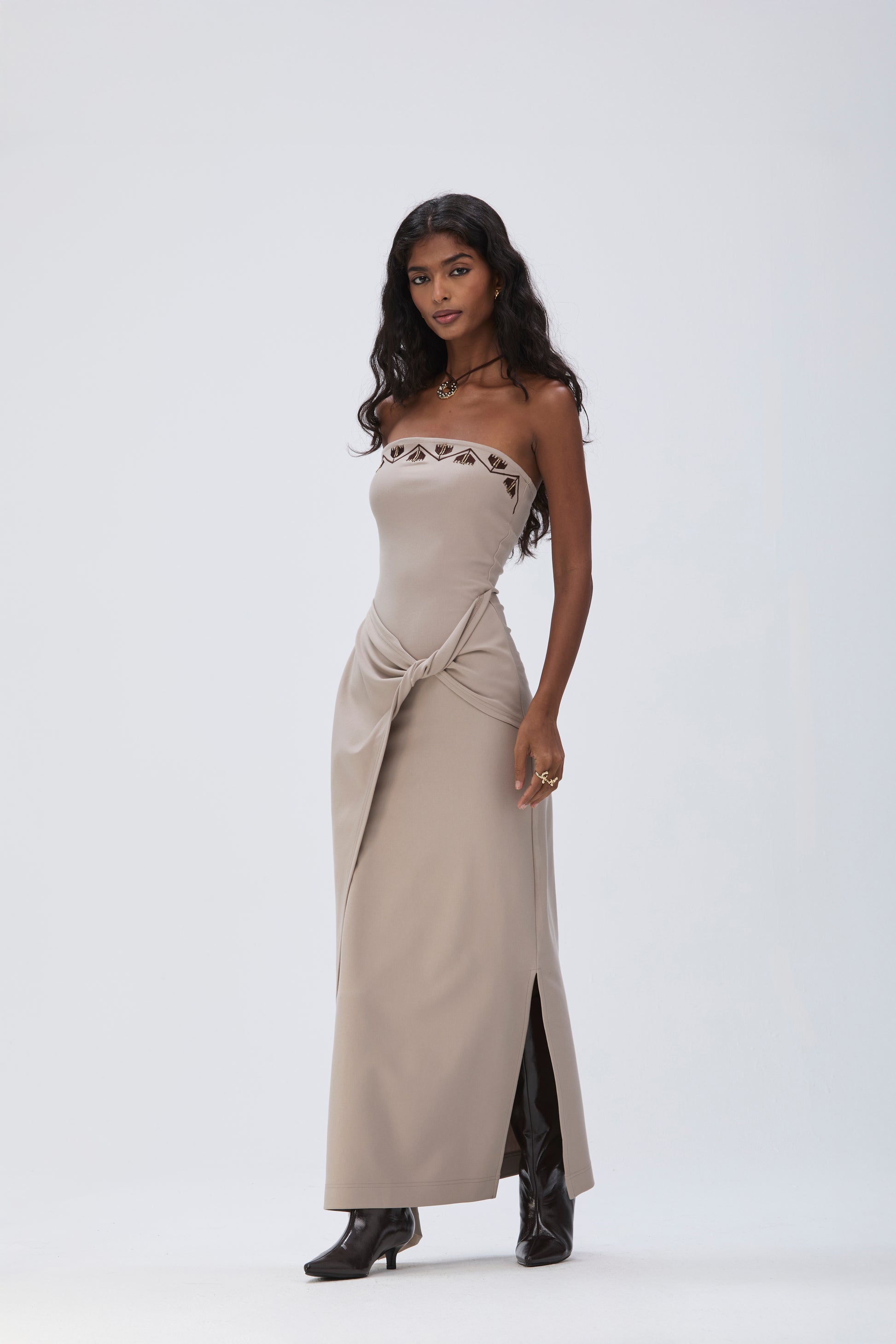 A matching co-ord dress featuring a strapless fitted bodice crafted from thick cotton stretch, elevated with contrast dark brown embroidery and gold hand embellishment. The design features a fold-over draped layer from the waist down, falling just below the ankles, and is finished with a side slit and a back zipper for easy wear.