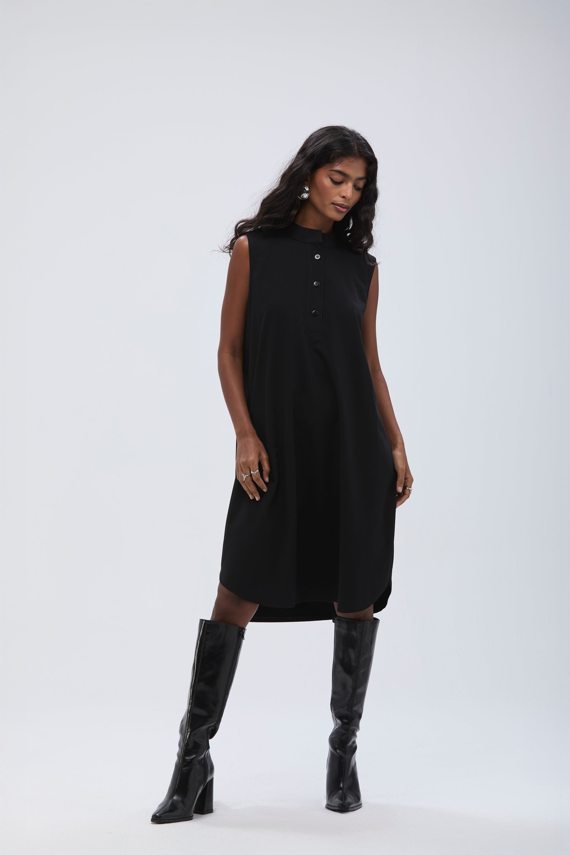A matching coord, A dishdasha-style dress crafted from cotton crepe, featuring a high collar with hidden front buttons for easy wear. The dress is a loose relaxed fit.
