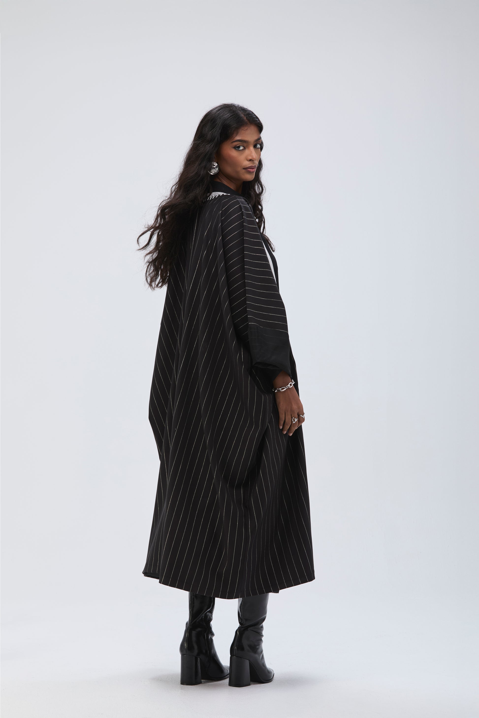 The Bisht is hand-crafted from a cotton-wool blend with metallic silver stripes, along with metallic silver embroidery around the front collar of the bisht features a loose, relaxed silhouette in a free size.