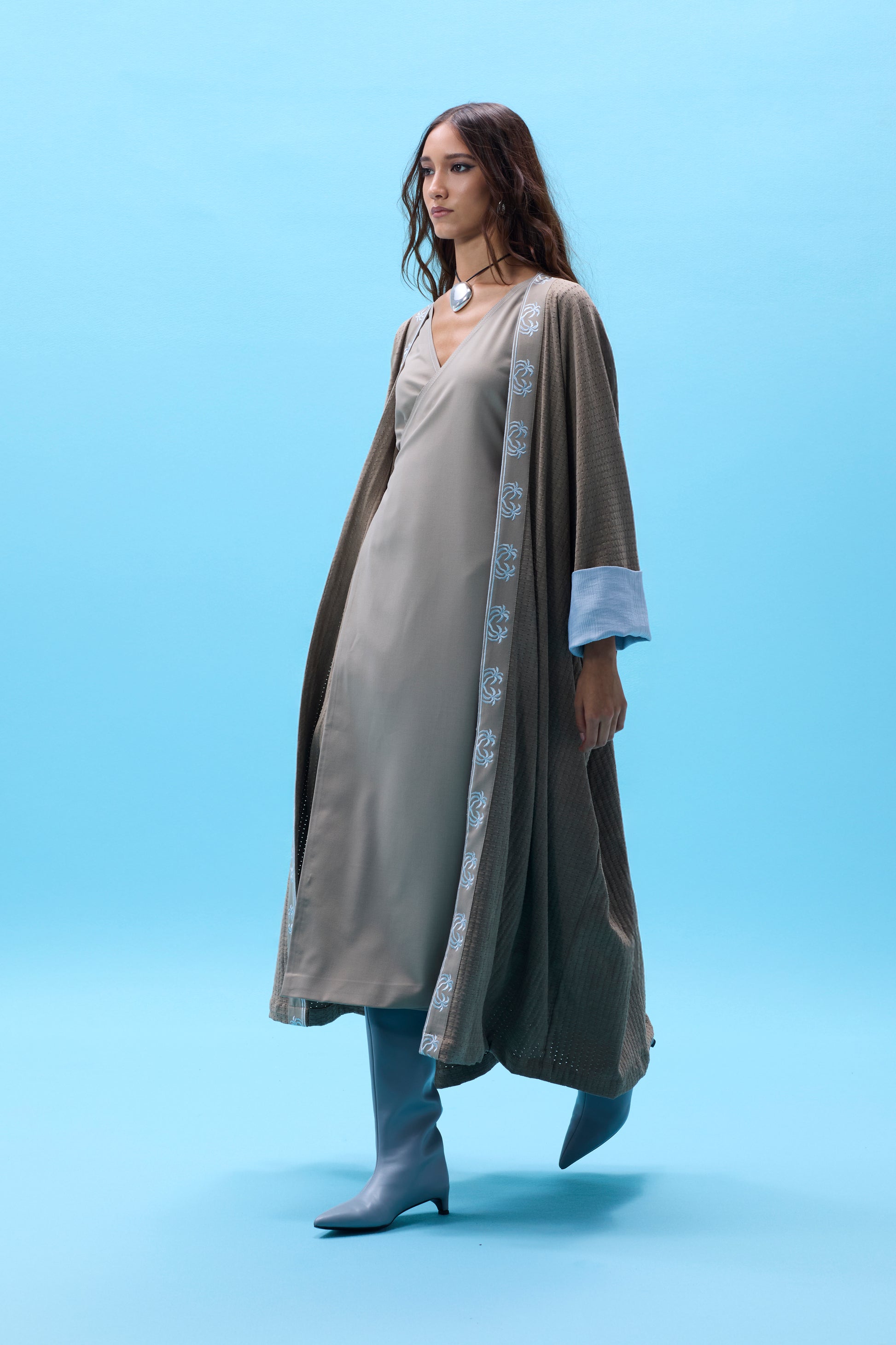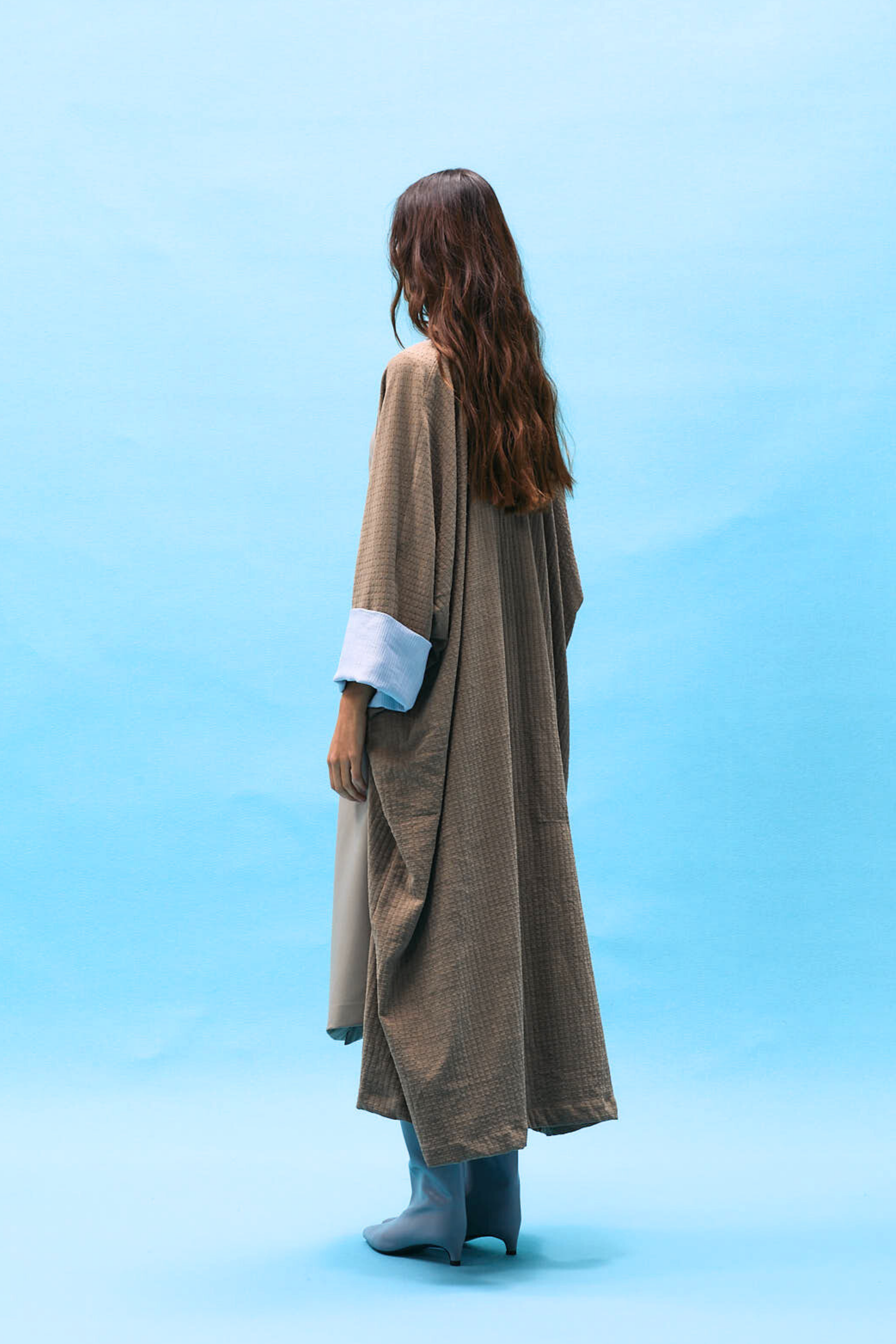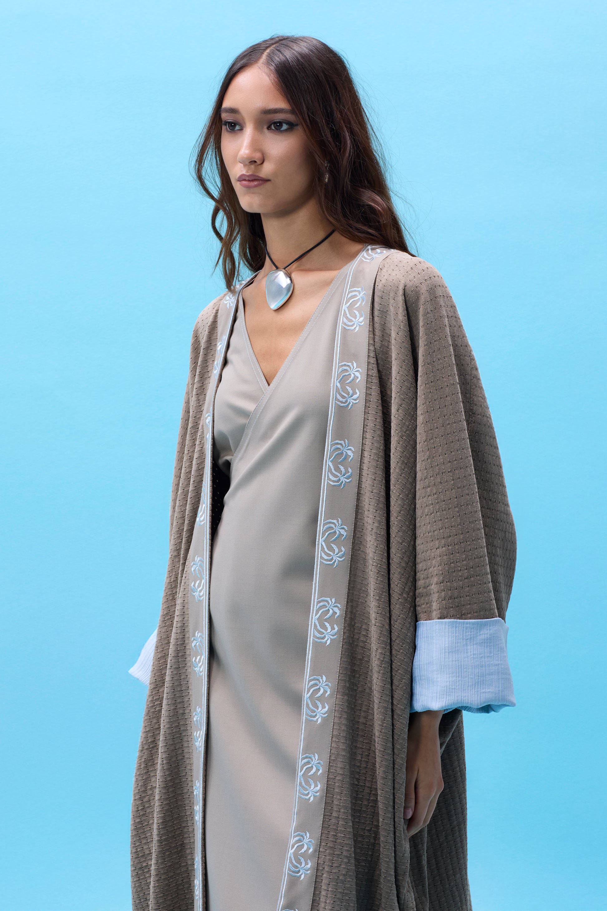 The Bisht is hand-crafted from a cotton–Knit blend, featuring contrast green palm embroidery along the front collar. It features a contrast sleeve panel made from crochet fabric. Designed with a loose, relaxed oversized silhouette, it comes in a free size. Offered in full midi length.