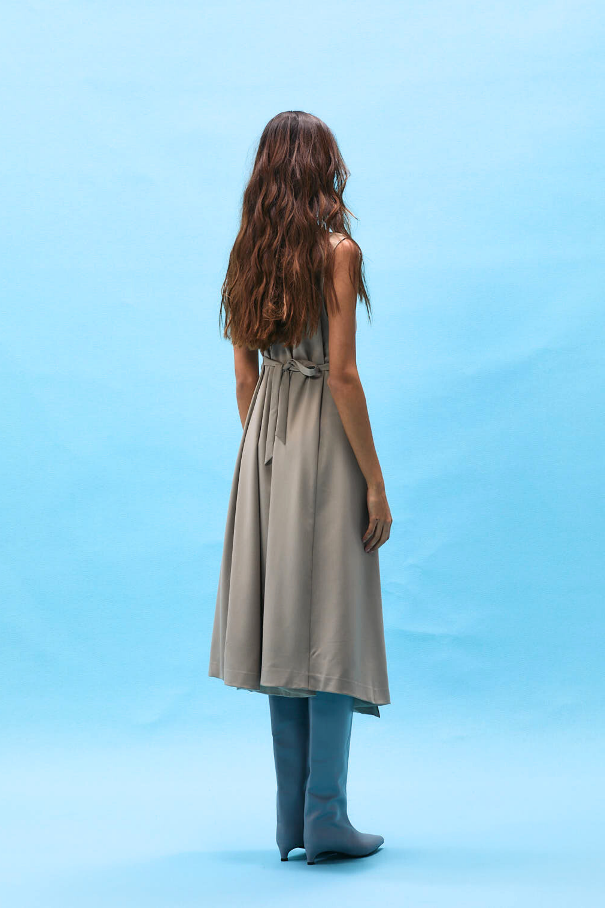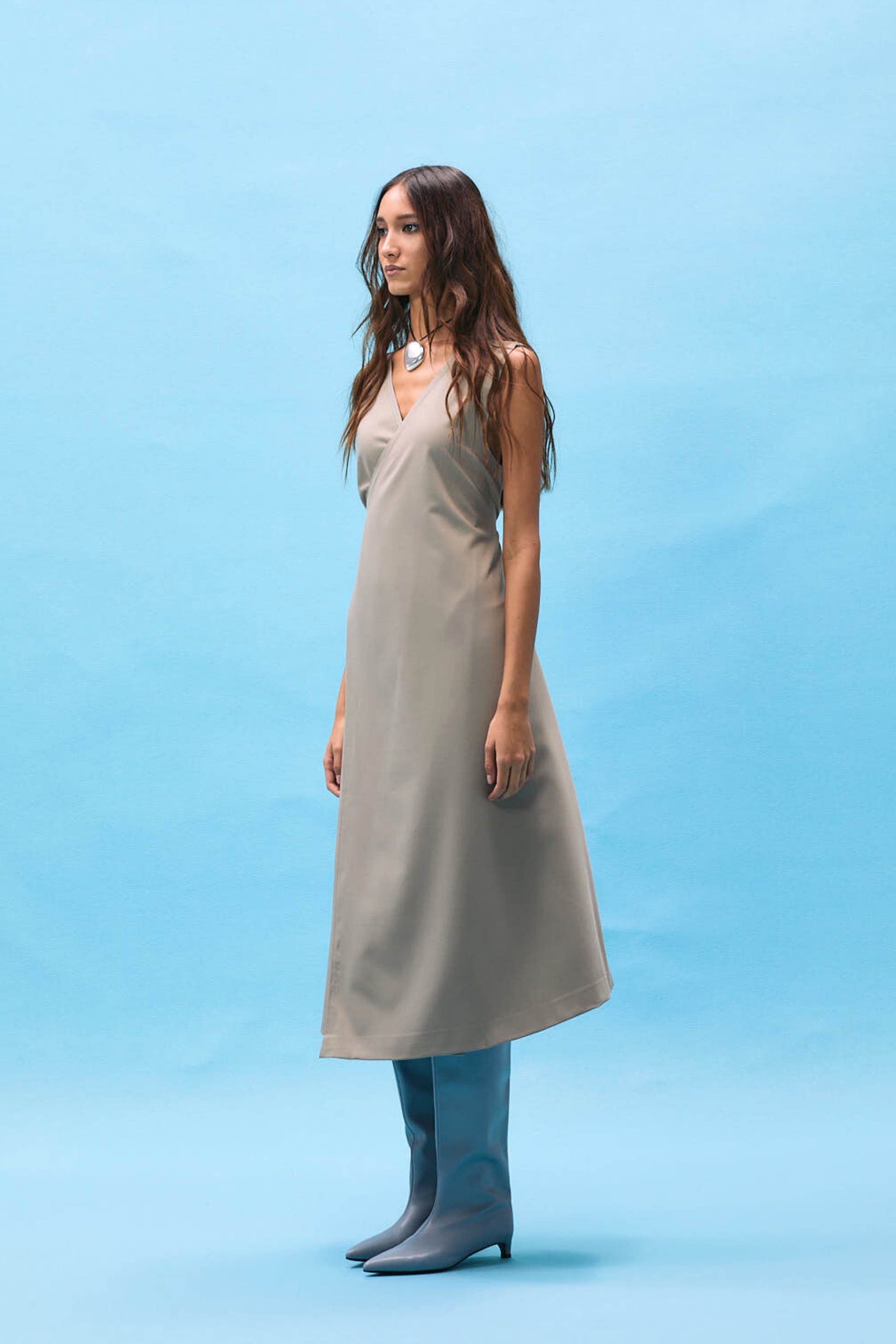 The Dress is a wrap-style design crafted from cotton silk, fully lined. It features contrast seam detailing and adjustable side strap ties for ease of wear. The fit is loose and relaxed, with a length that falls just below the knee.
