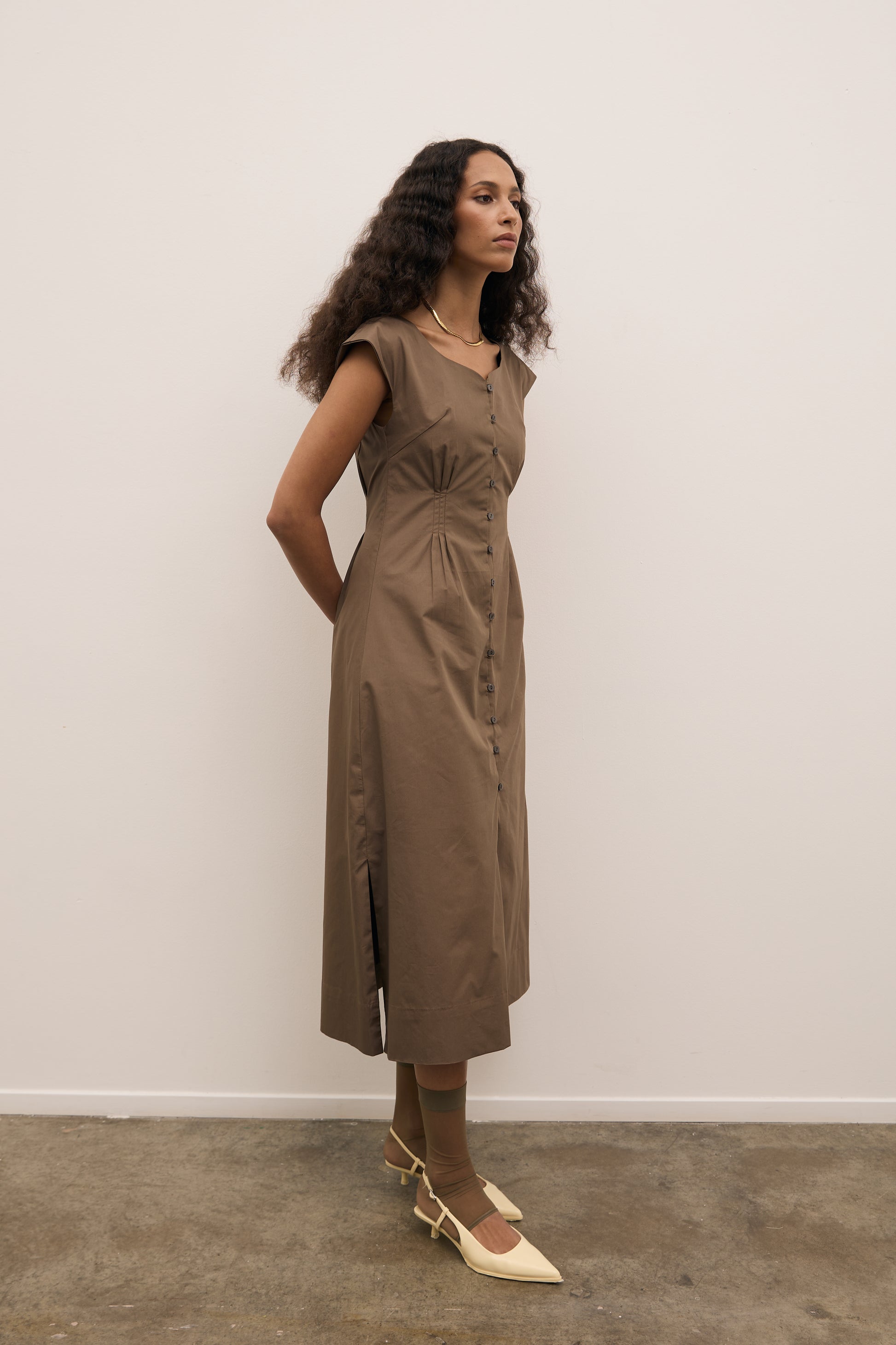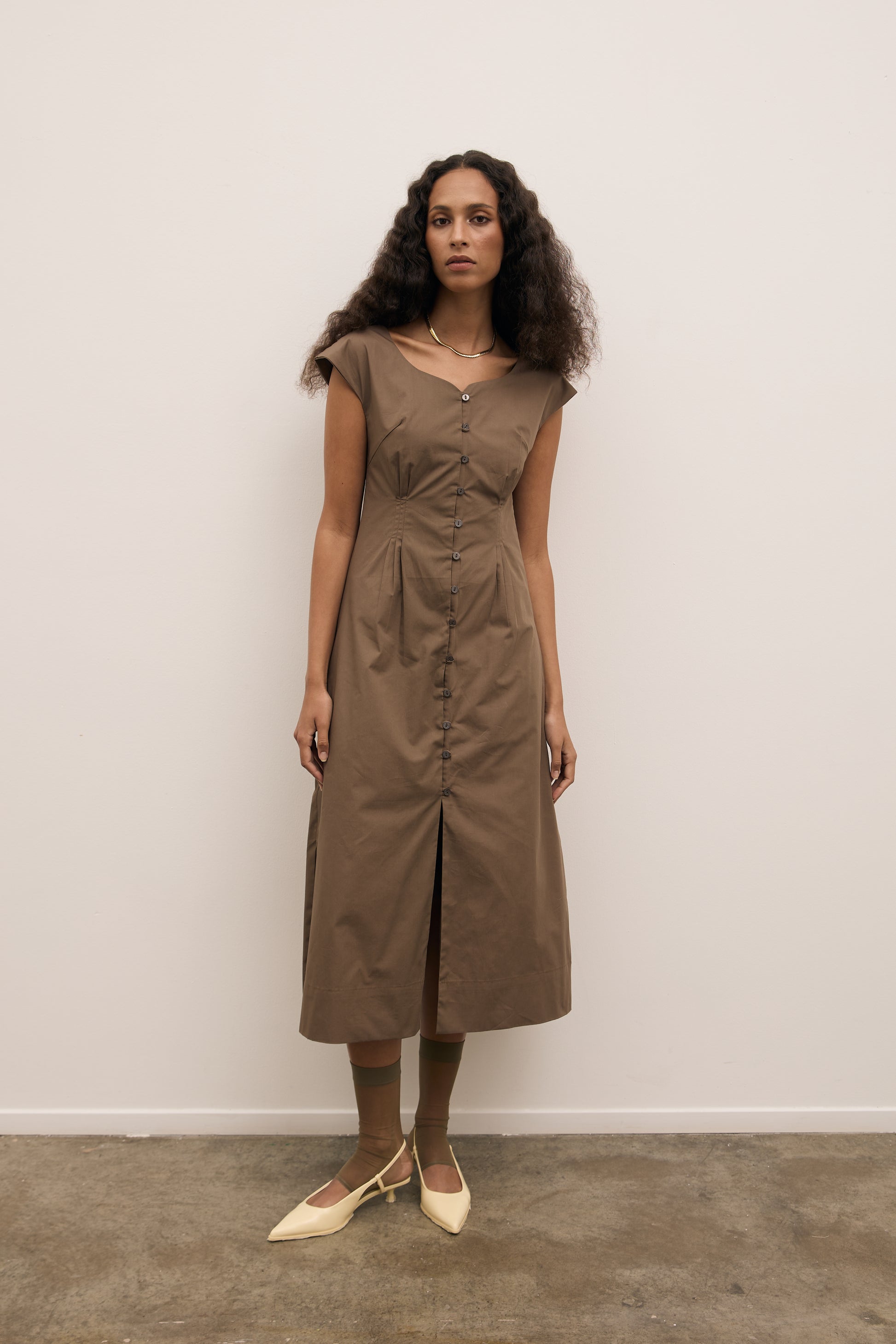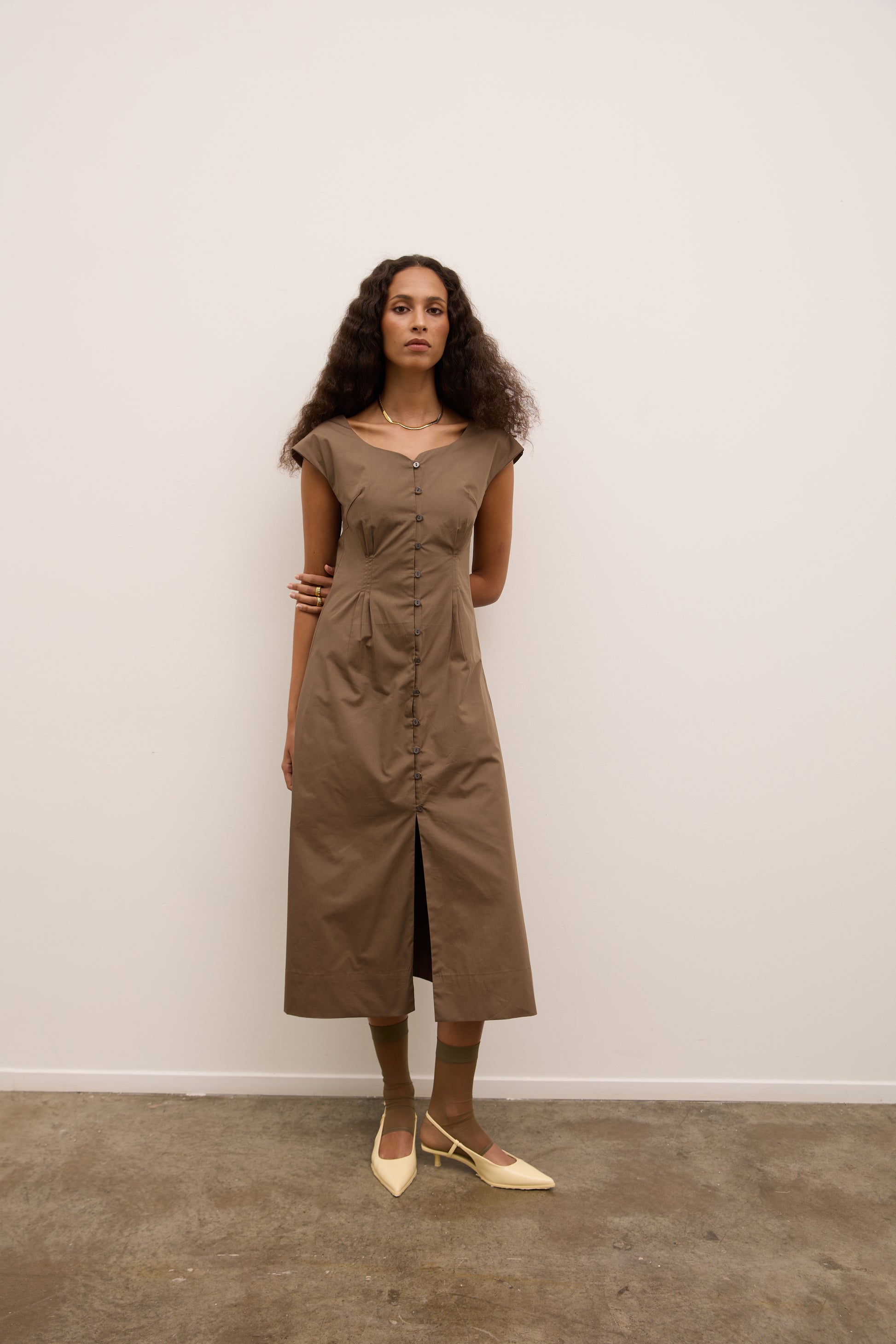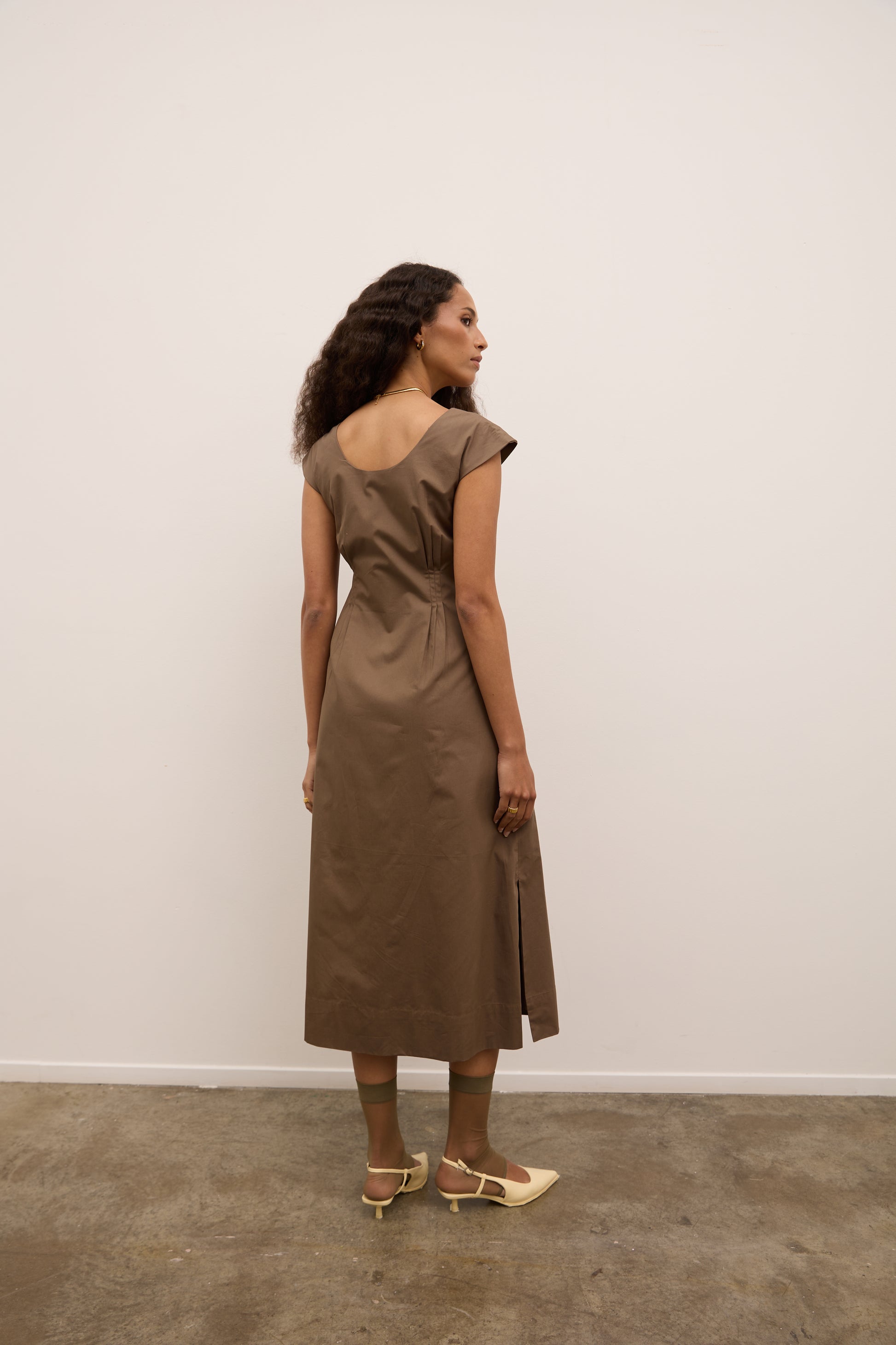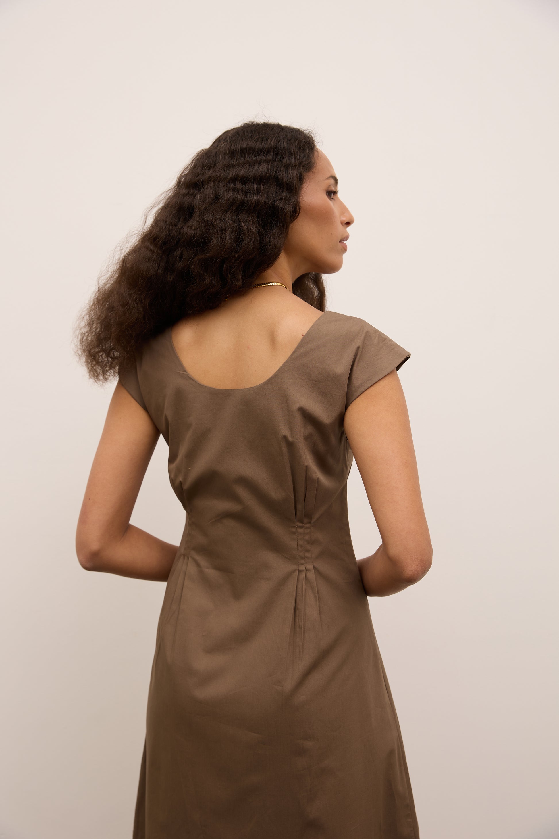 Fitted through the bust, it is gathered at the waist with front & back pleats and then falls into a soft A-line silhouette that crops below the knees.