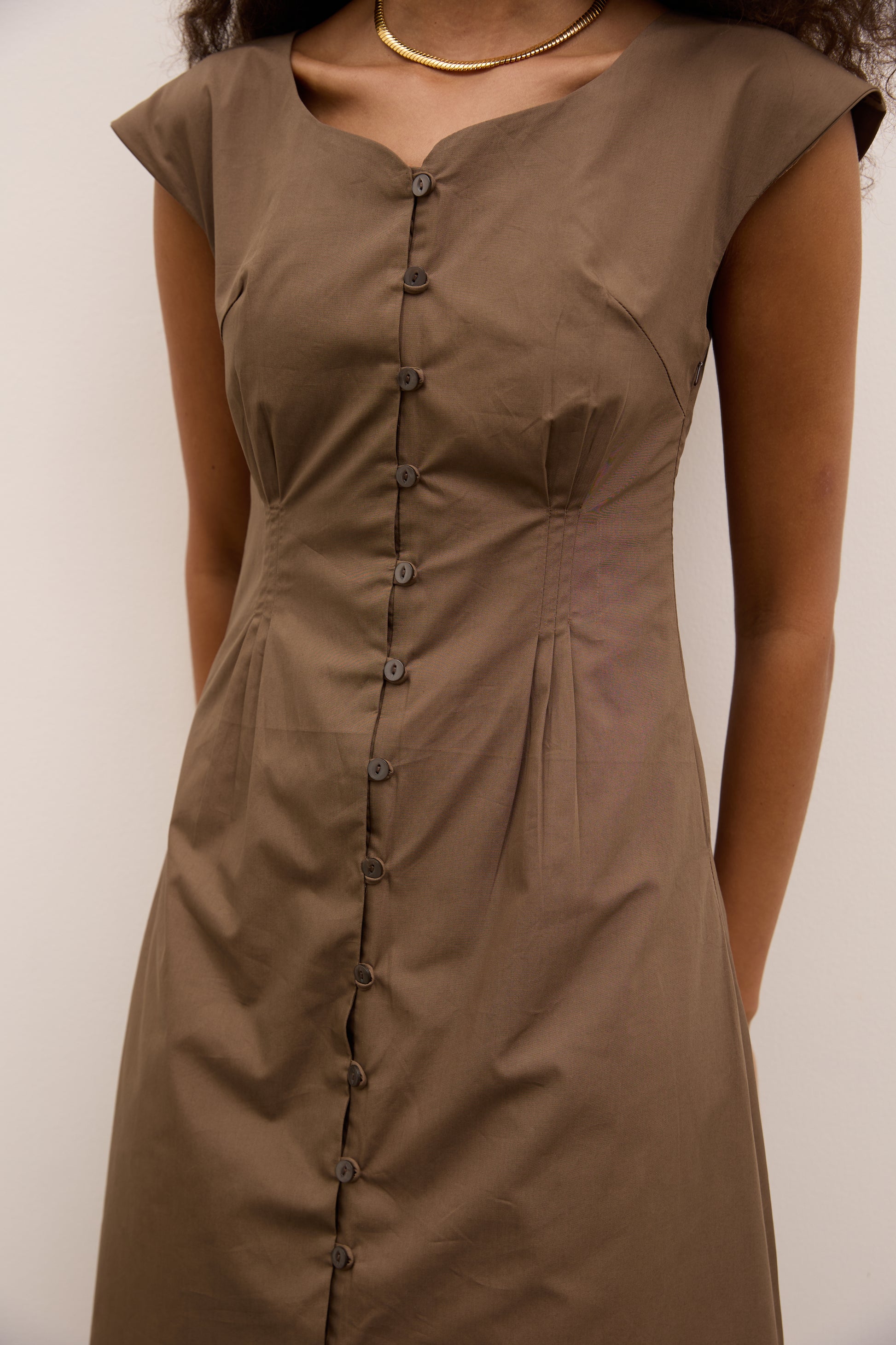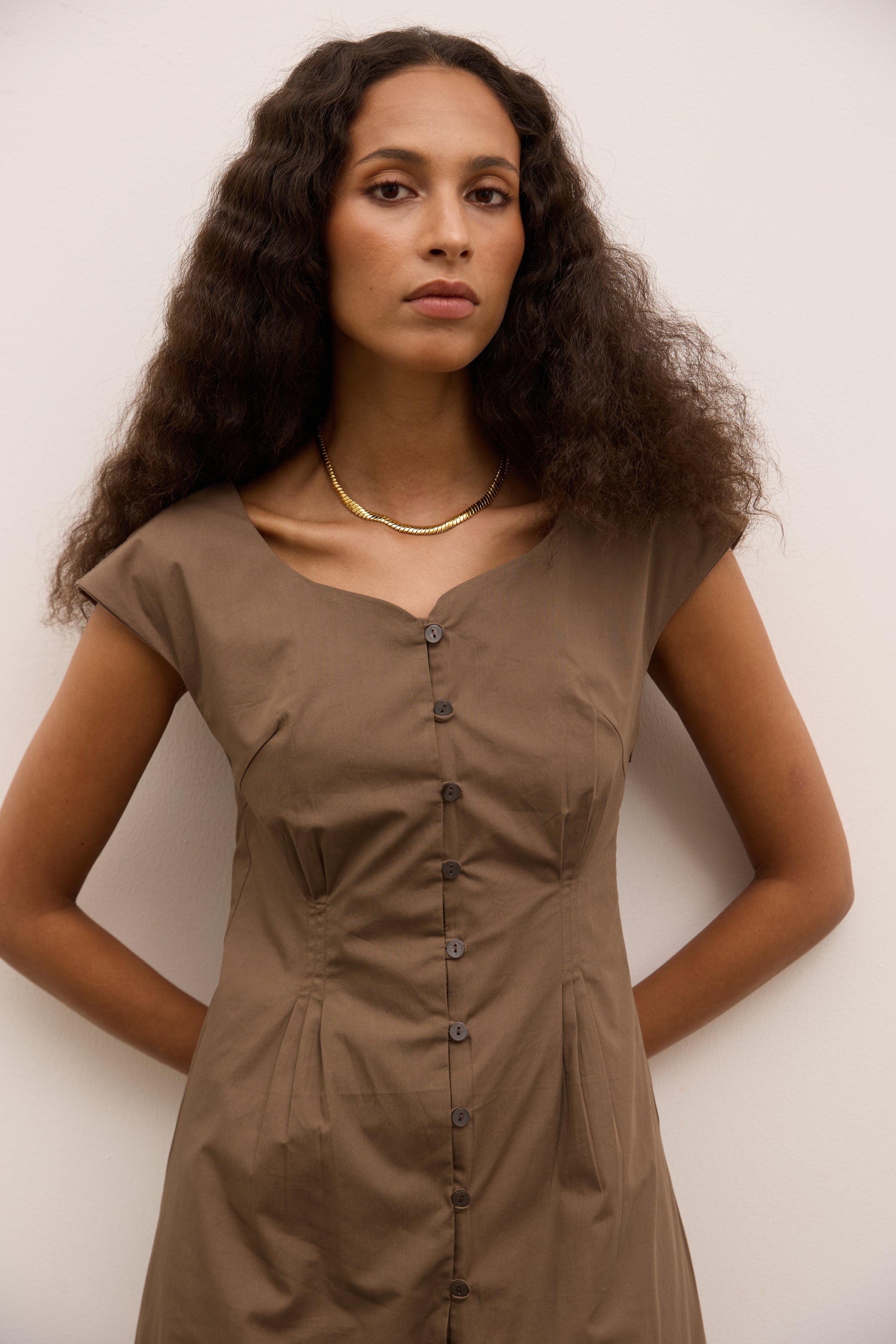 A feminine below the knee dress with a rounded neckline, front button for easy closure and adjusted waist.